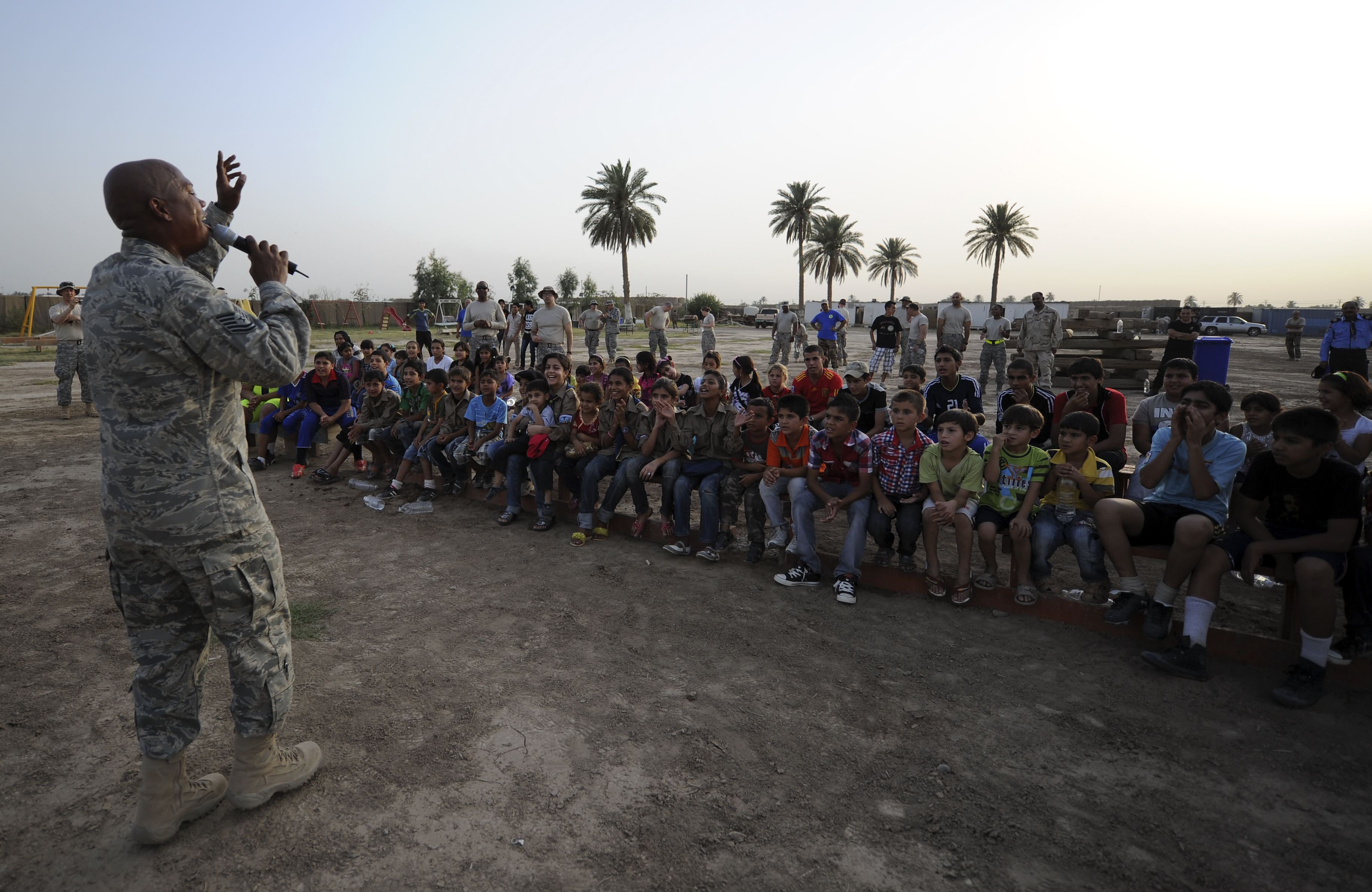 BISHKEK, Kyrgyzstan – A child at the Belovodskiy Orphanage holds the microphone as Tech. Sgt. Lane McCray sings July 6. The Air Forces Central Command Band Blue Hawk visited Kyrgyzstan to help build troop morale and public diplomacy. McCray is a vocalist with the band deployed from Naval Air Station Fort Worth Joint Reserve Base, Texas. (U.S. Air Force photo/Staff Sgt. Matthew Smith)