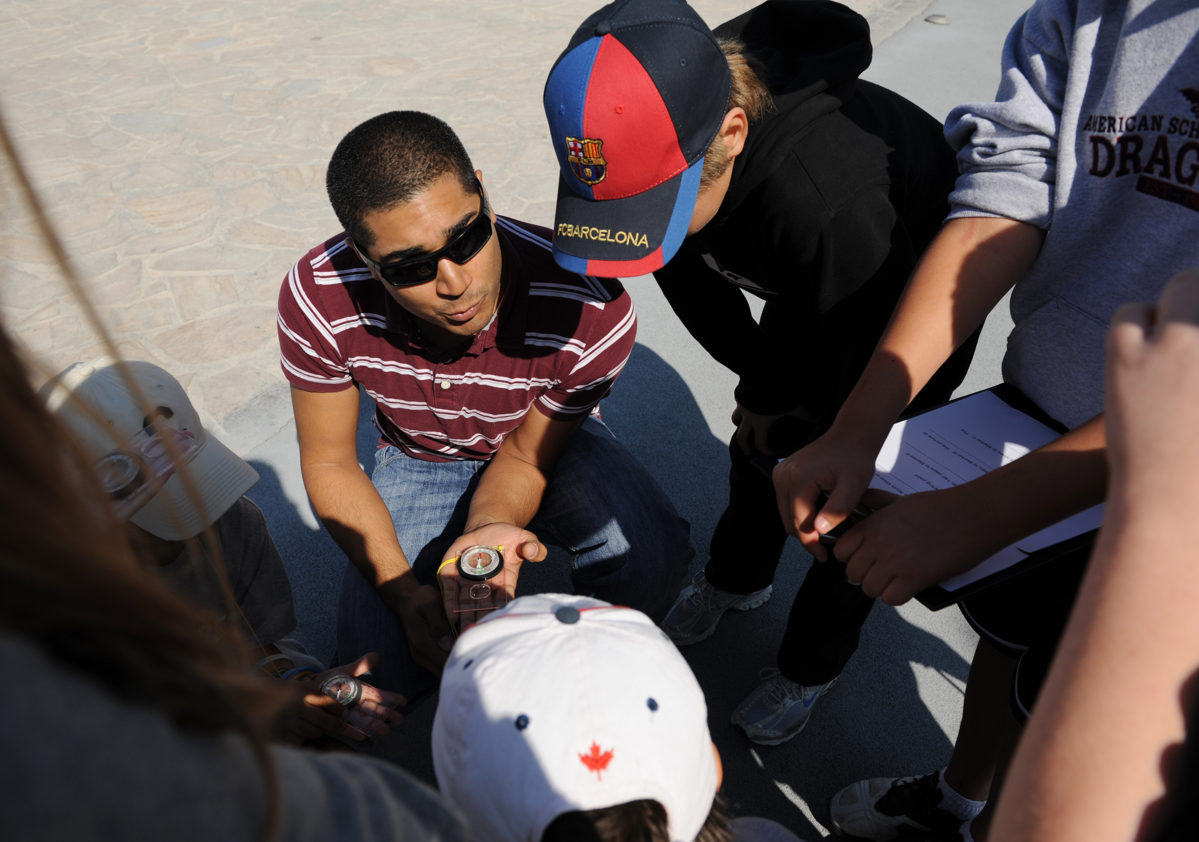 SOUTHWEST ASIA – Senior Airman Ruben Heredia explains a compass to 5th graders during their Explorers Field Day Jan. 26, 2012. Heredia used land navigation techniques to teach the children how to use a compass. Heredia is a native of San Antonio and is currently deployed from Kadena Air Base, Japan. (U.S. Air Force photo/Staff Sgt. Nathanael Callon)