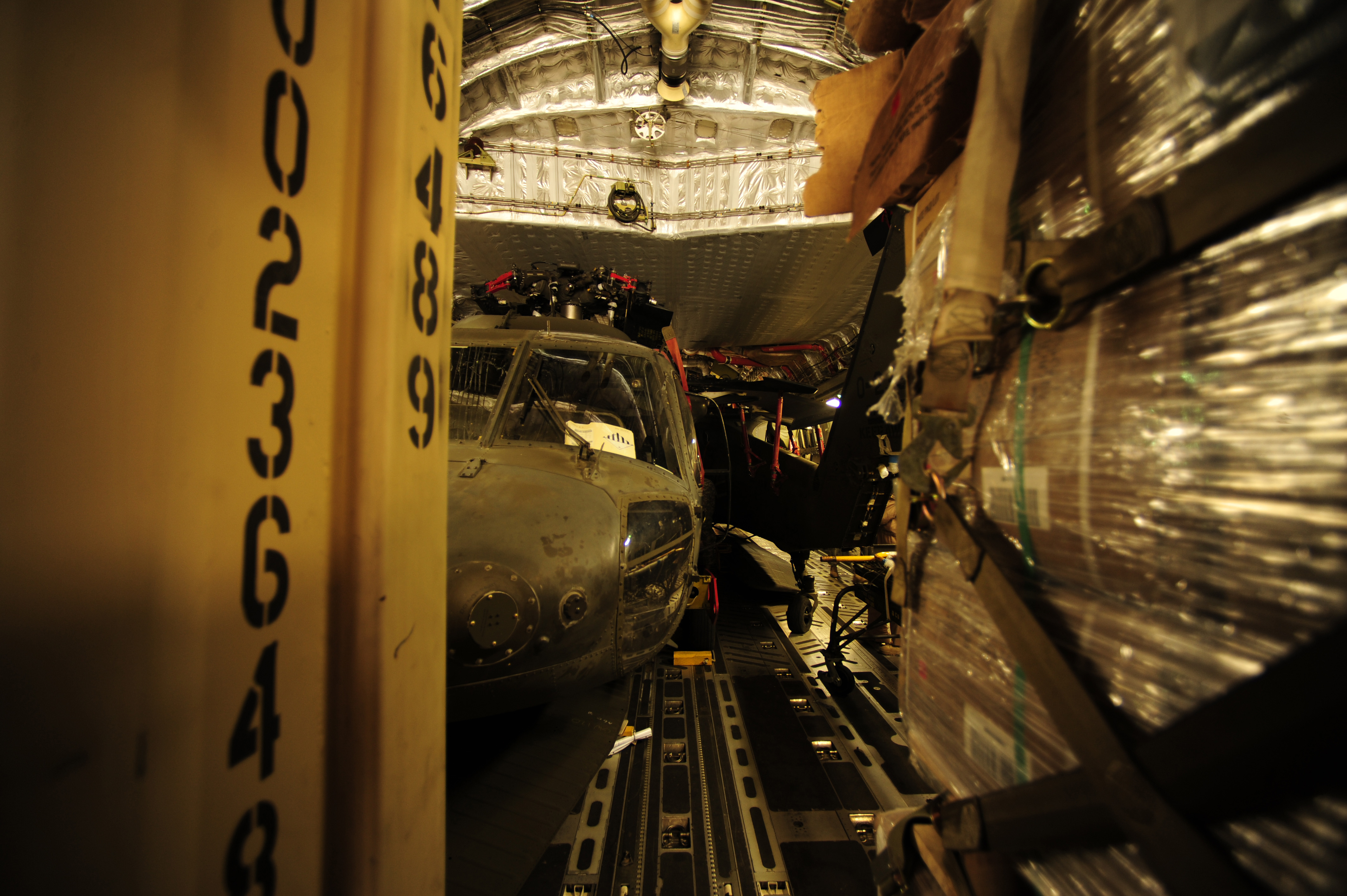 U.S. Air Force airmen from the 818th Contingency Response Element and U.S. Army soldiers from the 16th Combat Aviation Brigade take the straps off of UH-60 Blackhawk helicopters and cargo aboard a C-17 Globemaster III aircraft at Chaklala Air Force Base, Pakistan on Sept. 1, 2010. The 16th CAB just arrived in Pakistan and is going to air transport supplies throughout the country. (U.S. Air Force photo by Staff Sgt. Andy M. Kin / Released)