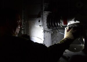 A U.S. Air Force pilot assigned to the 28th Expeditionary Air Refueling Squadron, conducts preflight checks on a KC-135 Stratotanker at Al Udeid Air Base, Qatar, Sept. 28, 2019. The 28th EARS, part of U.S. Air Forces Central Command, is responsible for delivering fuel to U.S. and coalition forces,