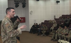 As music begins to play, the crowd of deployed members at Al Dhafra Air Base, United Arab Emirates, grows larger and larger to watch the Air Forces Central Command band perform. These dynamic musicians perform and tour in small ensembles throughout the Area of Responsibility, positively improving