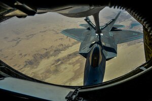 A KC-135 Stratotanker crew assigned to the 340th Expeditionary Air Refueling Squadron refueled an F-22 Raptor during a mission in support of Operation Inherent Resolve, June 20, 2017 above Southwest Asia. The F-22 is a component of the Global Strike Task Force, supporting U.S. and coalition forces