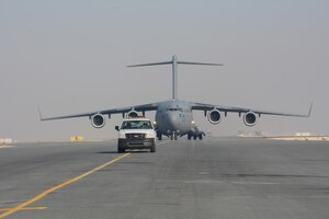 A team of airmen use a C-17 Globemaster III to deliver two 3-6 Heavy Cavalry Regiment Apache helicopters from Fort Bliss, Texas to Al Udeid Air Base, Qatar Dec. 13. The helicopters are scheduled to take part in the annual Qatar National Day Parade set for Dec. 18. Qatar National Day is a holiday to