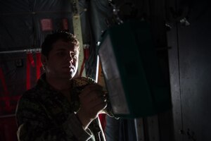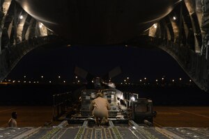 U.S. Air Force Senior Airman Rebecca, 816th Expeditionary Airlift Squadron loadmaster, guides a pay-loader to load cargo on board a C-17 Globemaster III in support of Operation Inherent Resolve in Kuwait, August 14, 2015. OIR is the military intervention against Daesh. (U.S. Air Force photo by Staff