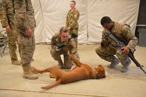 Airmen deployed to Al Udeid Air Base, Qatar, gathered for a military working dog demonstration hosted by 379th Expeditionary Security Forces Squadron Airmen April 6, 2014.The 379th ESFS uses demonstrations as an opportunity to educate the base populous on what the MWD mission and how the mission