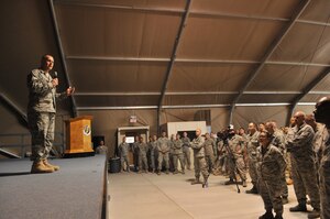 The Air Force's top enlisted leader, Chief Master Sgt. of the Air Force James A. Roy, visited members of the 376th Air Expeditionary Wing here June 11 during a Central Command Area of Responsibility tour.During the visit, Chief Roy toured the Transit Center and spoke with Airmen during an "all