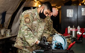 Airmen from the 378th Expeditionary Fighter Squadron aircrew flight equipment perform maintenance on equipment Feb. 11, 2021, at Prince Sultan Air Base, Kingdom of Saudi Arabia. AFE Airmen are responsible for inspecting, maintaining, packing and adjusting equipment such as flight helmets, oxygen