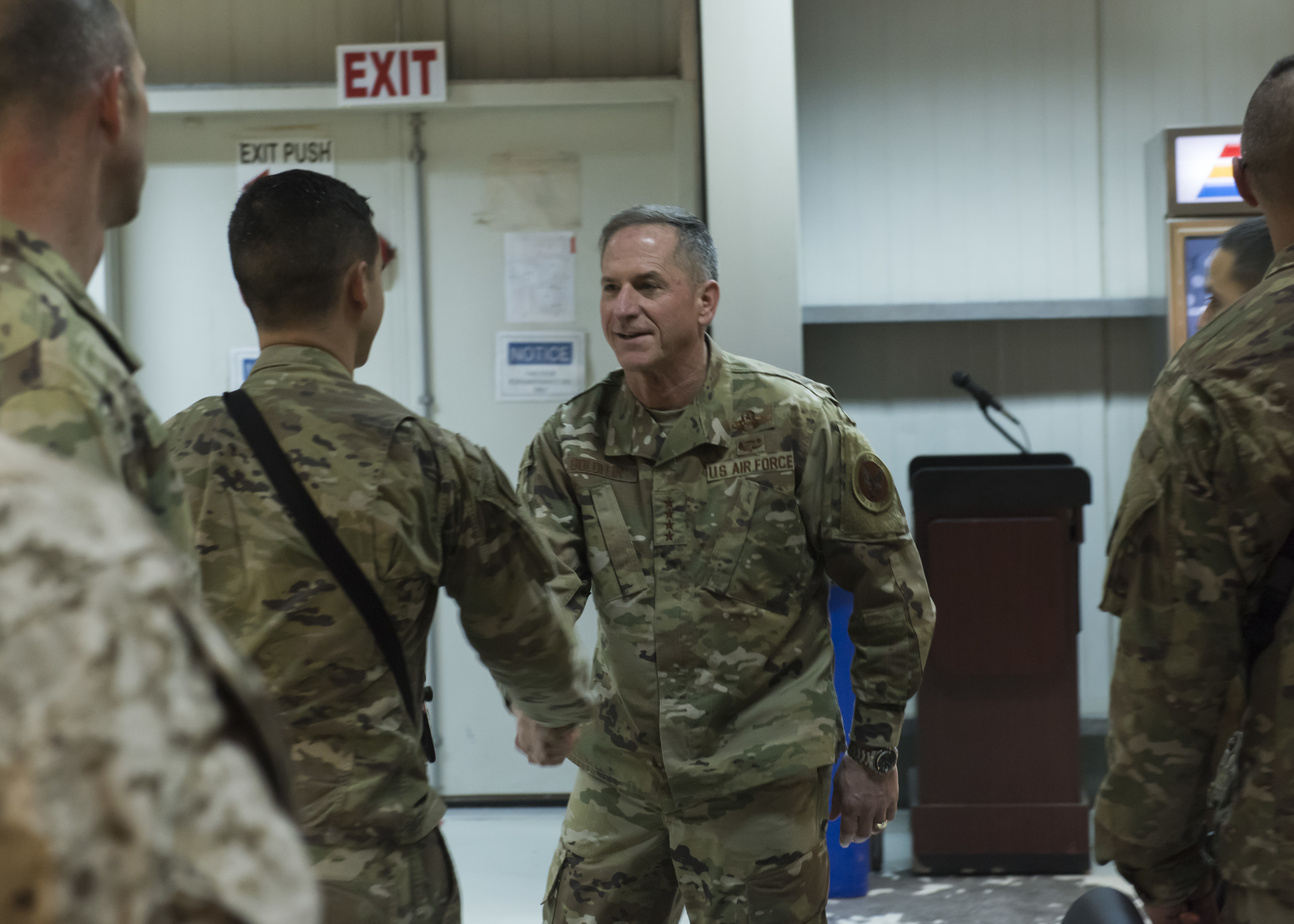 Maj. Gen. Chad Franks, the Deputy Commander, Operations and Intelligence, Combined Joint Task Force-Operation Inherent Resolve, speaks with Air Force Chief of Staff Gen. David L. Goldfein and Chief Master Sgt. of the Air Force Kaleth O. Wright during a recent visit to an undisclosed location in Southwest Asia, Dec. 20, 2018. Airmen were given the opportunity to discuss changes occurring in the Air Force with leadership during the visit. (U.S. Air Force photo by Staff Sgt. Jeremy L. Mosier)