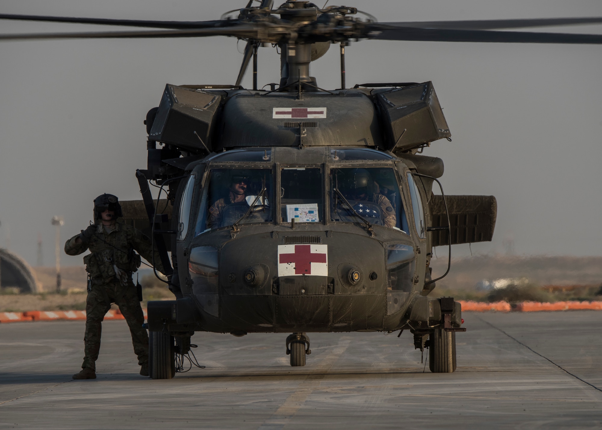 U.S. Army personnel prepare to unload patients at an undisclosed location in Southwest Asia, Jan. 31, 2019. The 386th Expeditionary Medical Group facilitate transfers of ill personnel from across the area of responsibility back to the United States or other locations to receive required care. (U.S. Air Force photo by Staff Sgt. Jeremy L. Mosier)