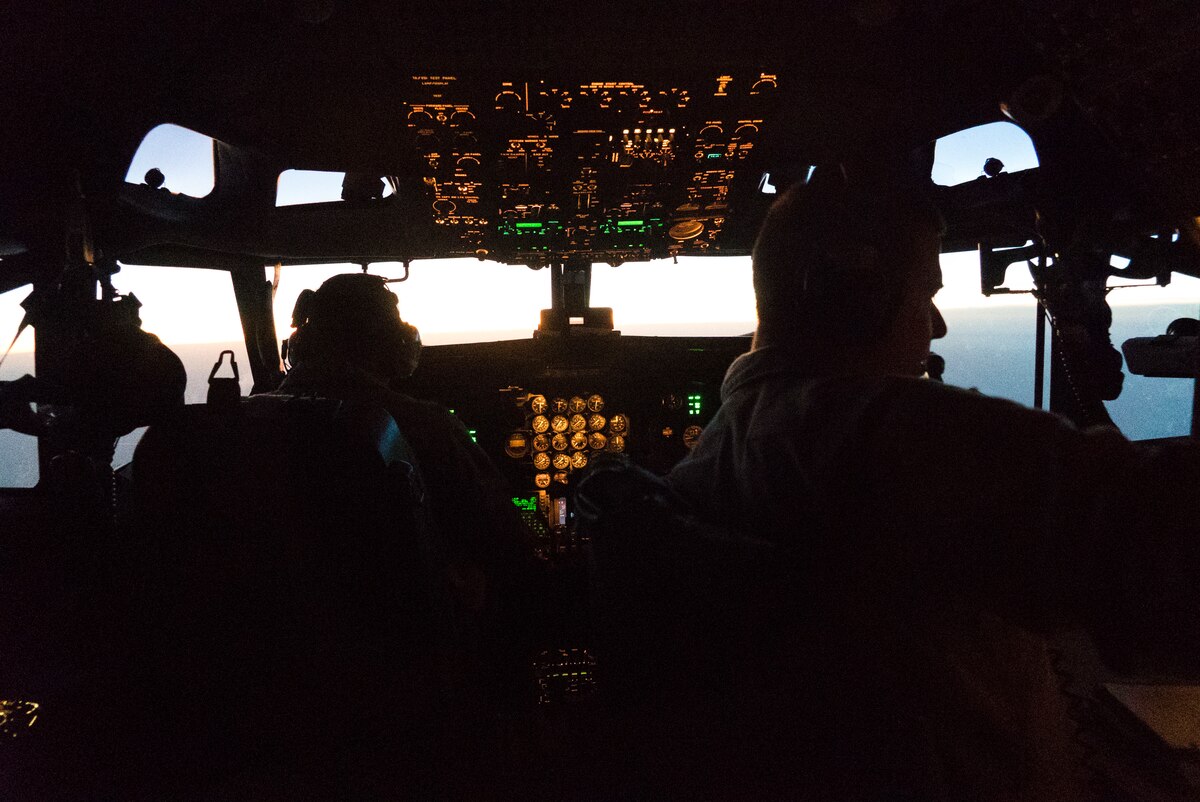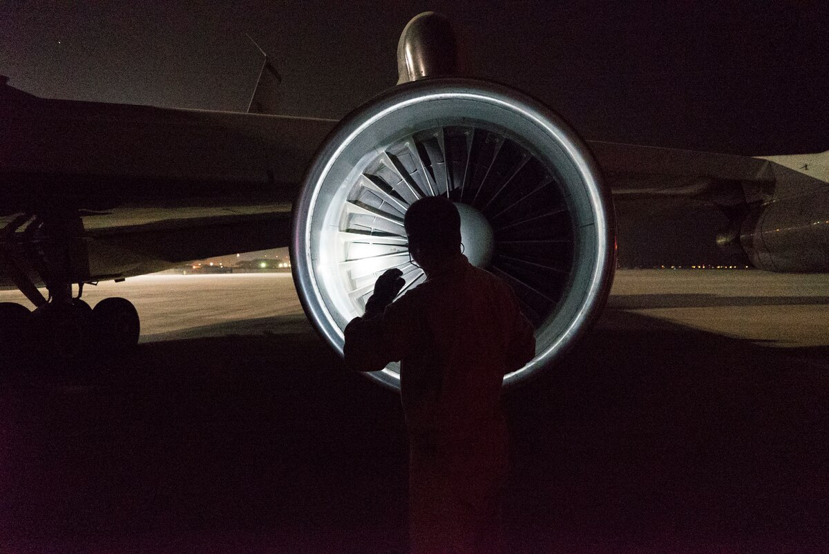 A U.S. Air Force flight engineer assigned to the 7th Expeditionary Airborne Command and Control Squadron, performs preflight inspections on an E-8 Joint STARS at Al Udeid Air Base, Qatar, Sept. 28, 2019. The E-8 Joint STARS is an airborne battle management, command and control, intelligence, surveillance and reconnaissance platform. (U.S. Air Force photo by Senior Airman Roslyn Ward)