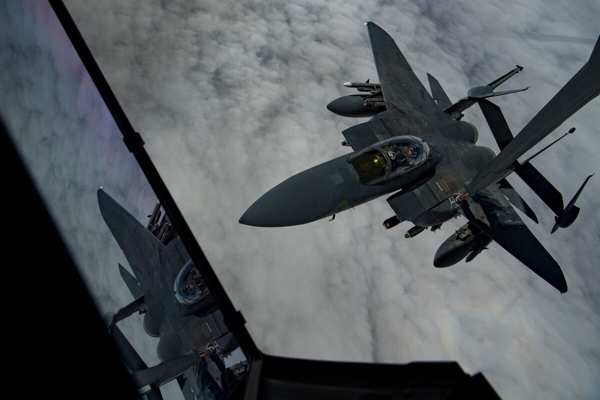 A U.S. Air Force F-15E Strike Eagle assigned to the 494th Expeditionary Fighter Squadron approaches the boom of a U.S. Air Force KC-10 Extender assigned to the 908th Expeditionary Air Refueling Squadron above the U.S. Central Command area of responsibility, Jan. 15, 2020. The 908th EARS, deployed with U.S. Air Forces Central Command, is responsible for delivering fuel to U.S. and coalition forces, enabling war-winning air power, deterrence, and stability to the region. (U.S. Air Force photo by Staff Sgt. Daniel Snider)