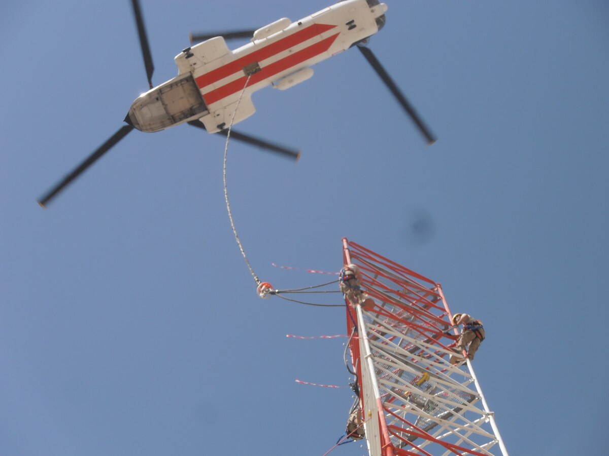Members of Air National Guard Engineering and Installation Team prepare to connect tower sections while a civilian contractor helicopter lowers sections into place. A specialized team from several Air National Guard Engineering Installation Squadrons deployed to Bagram Airfield, Afghanistan, combined their efforts to built and setup the 170-foot communications tower, greatly increasing radio communication range. (U.S. Air Force photo/1Lt. Bruce Champion)
