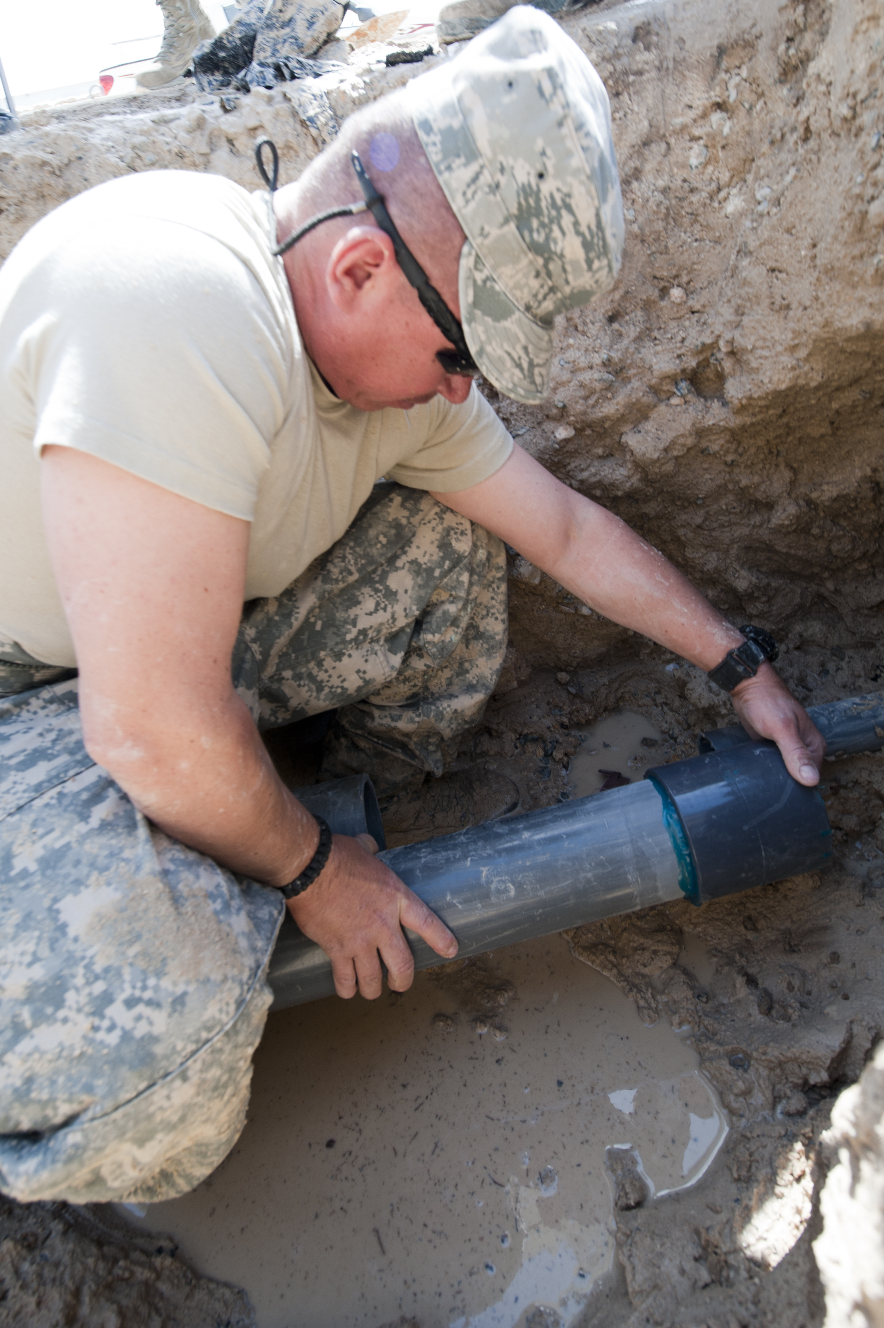 Staff Sgt. Antonio Martinez (left) and Senior Airman Joel Mendoza, 332nd Expeditionary Civil Engineer Squadron utilities shop members, tighten a dresser coupling at an undisclosed location in Southwest Asia, March 7, 2012. The coupling is used to connect two pieces of a water pipeline. Martinez is deployed from Peterson Air Force Base, Colo., and is a Florida native. Mendoza is deployed from Fairchild Air Force Base, Wash., and is a native of Ft. Lauderdale, Fla. (U.S. Air Force photo by Staff Sgt. Joshua J. Garcia/Released)