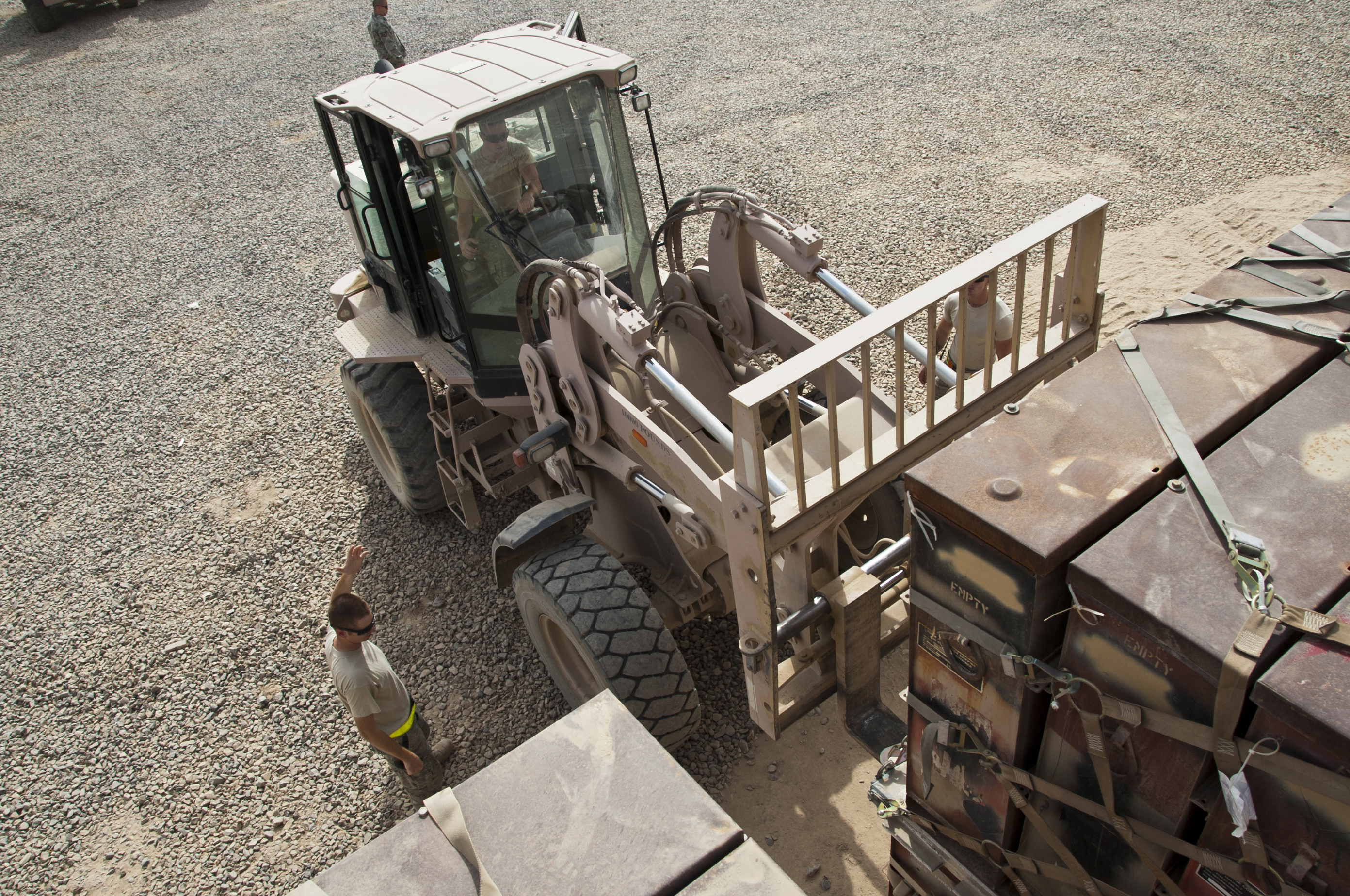 Members of the 451st Expeditionary Maintenance Squadron munitions flight load a pallet of certified munitions containers onto a trailer Aug. 8, 2011, at Kandahar Airfiled, Afghanistan. The pallets will then be turned in to the base's Defense Reutilization and Marketing Office for recycling. (U.S. Air Force photo by Senior Airman David Carbajal)