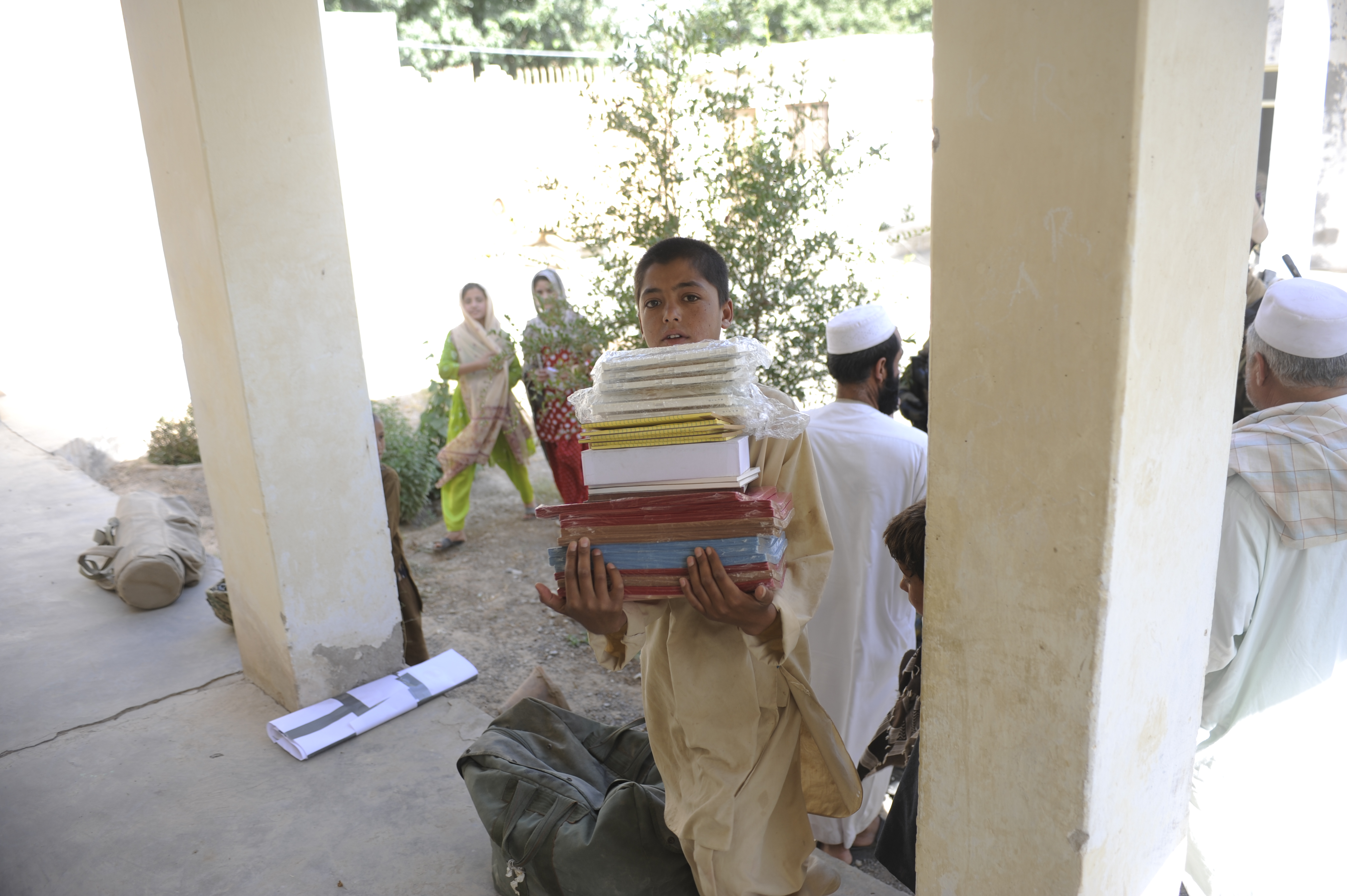 An Afghan child shows off his new notepad July 2nd, 2011, in Kandahar Province, Afghanistan, hoping for a pen to go with it. School supplies were handed out to the children, while the bulk of the supplies went to the local school as part of a humanitarian aid mission being conducted by servicemember of Kandarhar Airfield. (U.S. Air Force photo by Senior Airman Willard E. Grande II)