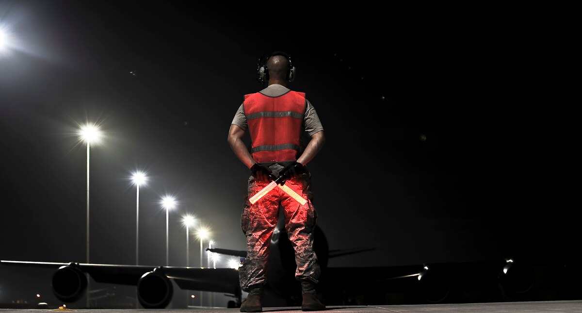 (Left to Right) Master Sgt. Matt Calisi, KC-135 Stratotanker boom operator; 1st Lt. Joseph Hellenbrand, KC-135 Stratotanker pilot; and Capt. Brian Sikkema, KC-135 Stratotanker aircraft commander; all of the 340th Expeditionary Air Refueling Squadron, review aircraft forms, prior to flying a mission, with Staff Sgt. Benjamin Peles, 340th Expeditionary Aircraft Maintenance Unit crew chief, July 31, 2011, in Southwest Asia. The aircrew is deployed from Kadena Air Base, Japan. (U.S. Air Force photo/Senior Airman Paul Labbe)