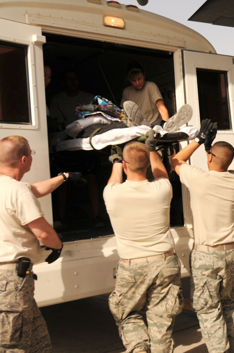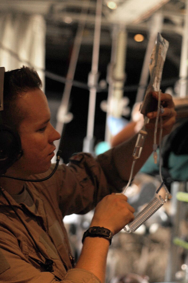 Lt. Col. Victoria Siptrott, flight nurse, and Staff Sgt. Jason Crewson, 2nd medical technician, 455th Expeditionary Aeromedical Evacuation Flight, ensure the brackets are working properly on a C-130 Hercules for an aeromedical evacuation flight to Bagram Airfield, Afghanistan, June 28, 2011. (U.S. Air Force photo by Senior Airman Krista Rose)