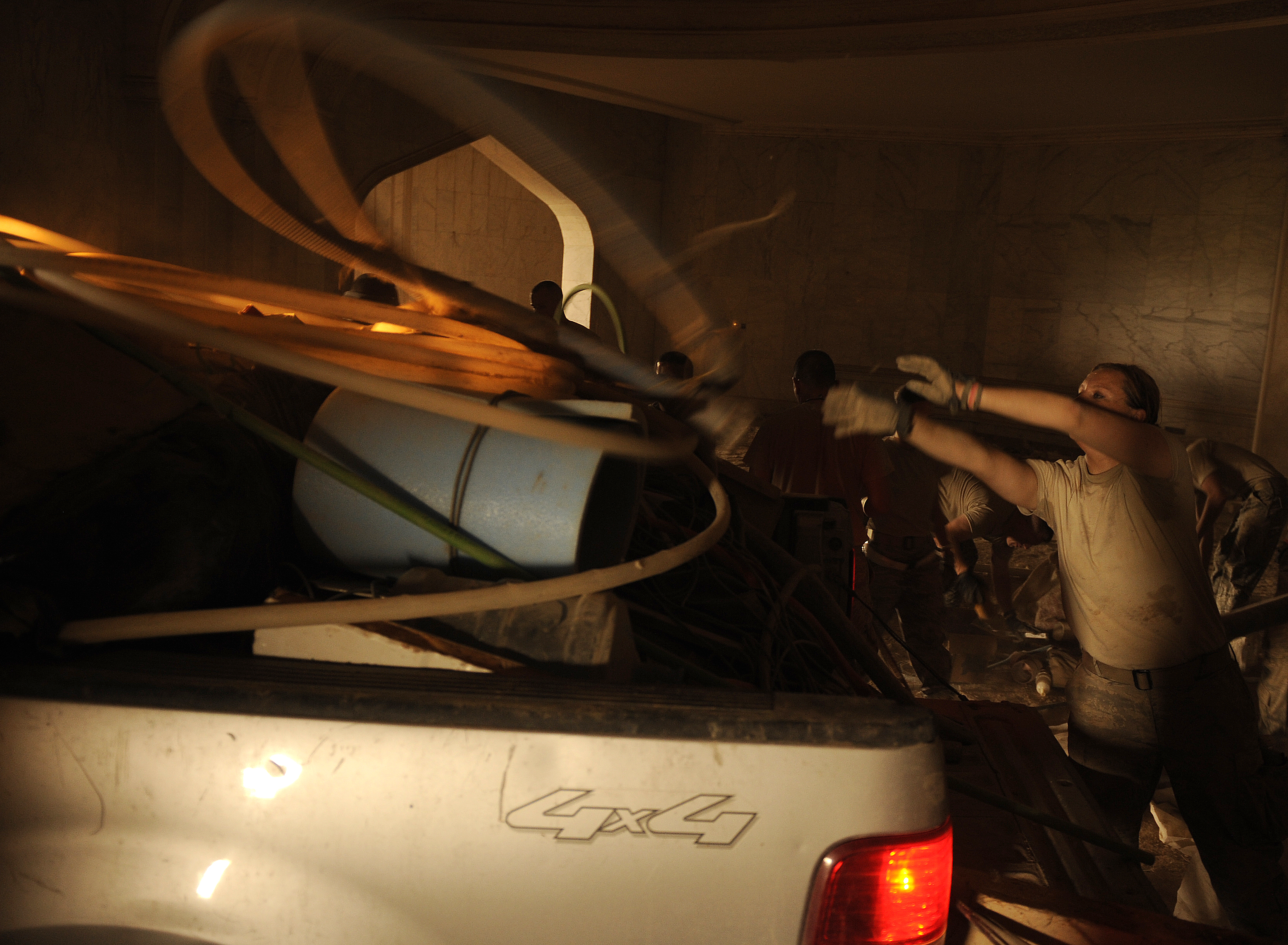 BAGHDAD, Iraq -- Senior Master Sgt. Jeff Gideon, 447th Air Expeditionary Group force support, hauls out plywood inside Victory Over America Palace during the last day of a three-day cleanup effort June 11. The San Antonio, Texas, native is deployed from Lackland Air Force Base, Texas. (U.S. Air Force/Tech. Sgt. Jason Lake)