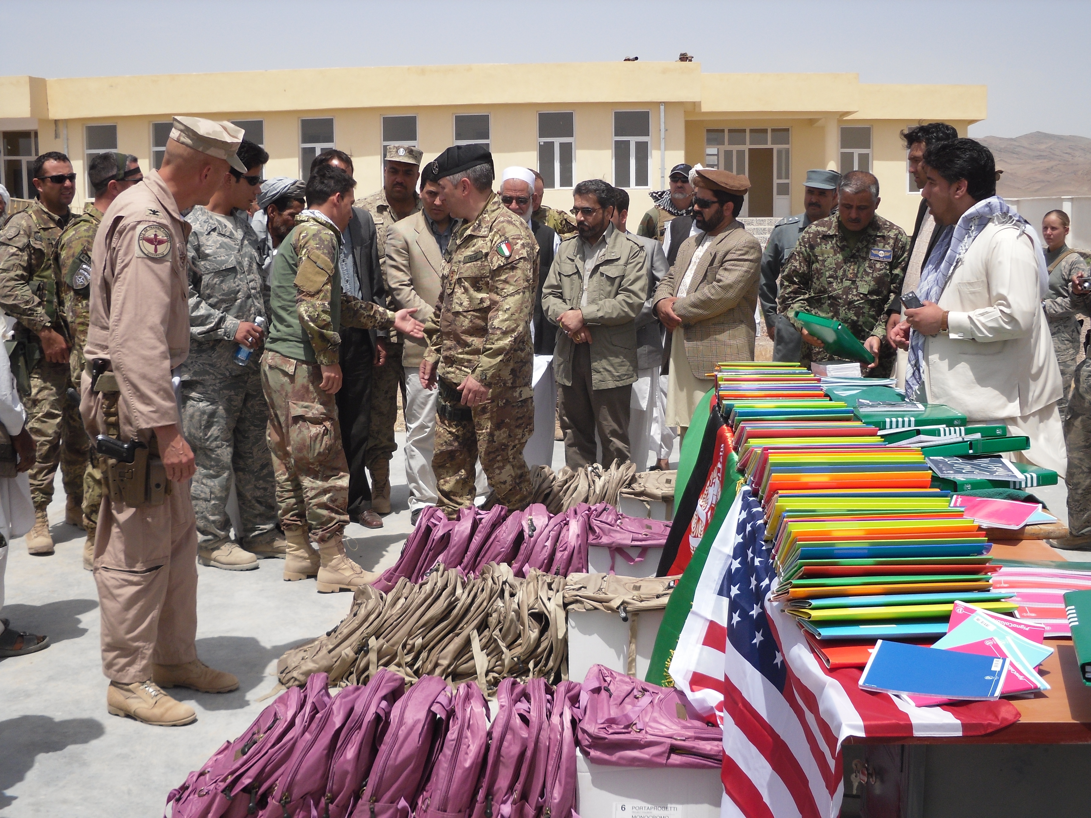 Tech. Sgt. Stacey Duvall, 838th Air Expeditionary Advisory Group, hands a local Afghan child a new folder and backpack May 12. Airmen from the 838th Air Expeditionary Advisory Group worked in conjunction with coalition partners and Afghan allies to help open a school in the village of Mandel located Southwest of Shindand in the Herat Province. (U.S. Air Force photo by Lt. Col. Joe Del Campo)