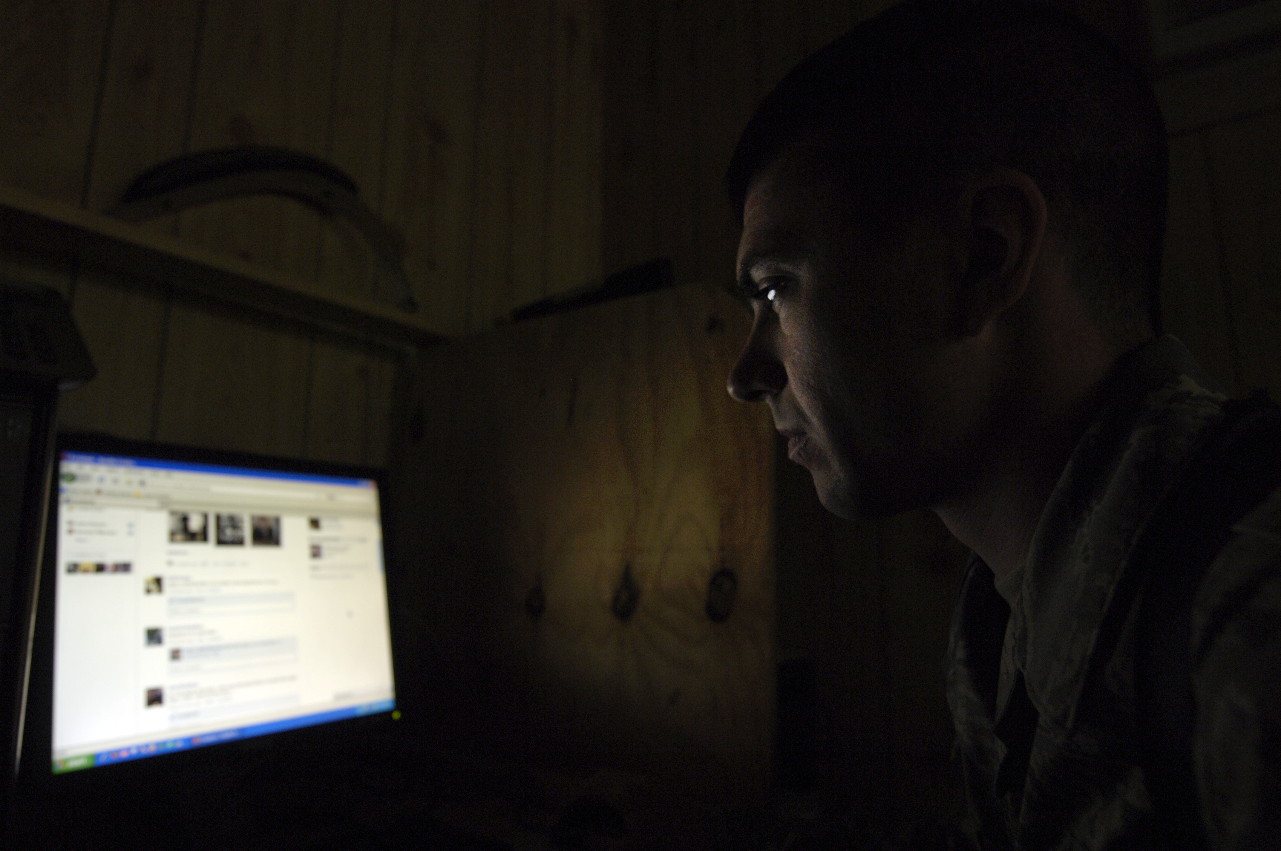 SATHER AIR BASE, Iraq – Staff Sgt. Levi Riendeau, 321st Air Expeditionary Wing photographer, updates his Facebook page in the morale, welfare and recreation trailer May 4. In the coming months, people at Sather should expect computer access to drop significantly as military forces prepare to leave Iraq. (U.S. Air Force photo by Tech. Sgt. Randy Redman)