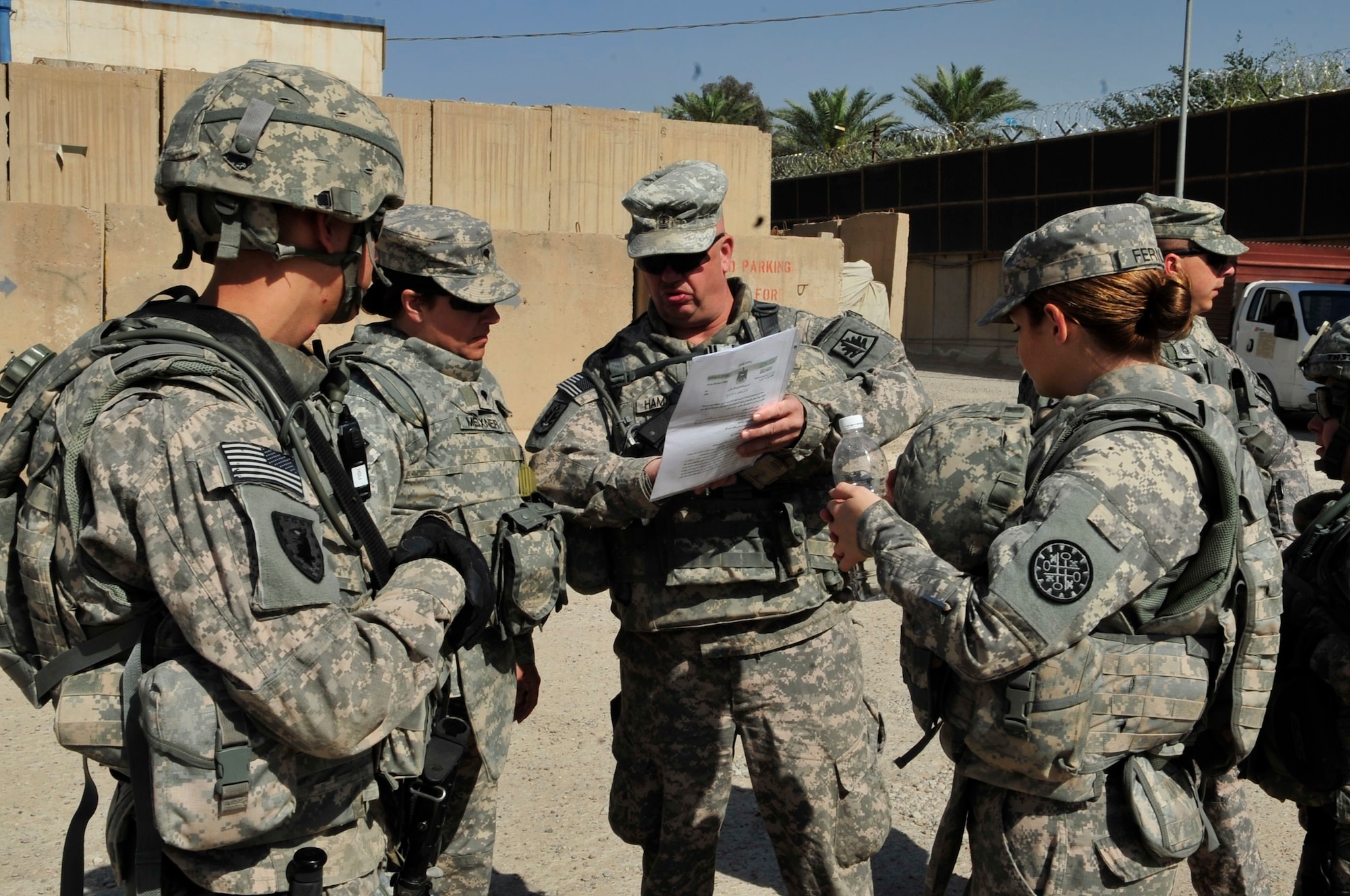 From left to right, U.S. Army Capt. Mark Weber, U.S. Forces – Iraq corrections assistance transition team officer in charge, from Greenfield, Iowa., U.S. Army Capt. Kristen Berdahl and U.S. Air Force Lt. Col. Kaylin Haywood Zapata discuss preparation for a mission at Joint Security Station Shield, Iraq, April 6, 2011. Before going outside-the-wire to assess the conditions at a women’s prison in Baghdad’s Rusafa District, these members of the corrections assistance transition team go over checklists of questions they will ask Iraqi officials at the facility. (U.S. Air Force photo by Senior Master Sgt. Larry A. Schneck)
