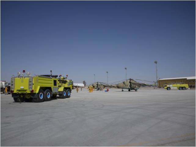 On March 24, NATO Fire officials and members of Kandahar Air Wing set-up of three crash vehicles which were part of a real-time fire exercise evaluating the fire department’s proficiency in responding to a Mi-17 aircraft crash at Kandahar Airfield. (U.S. Air Force photo)