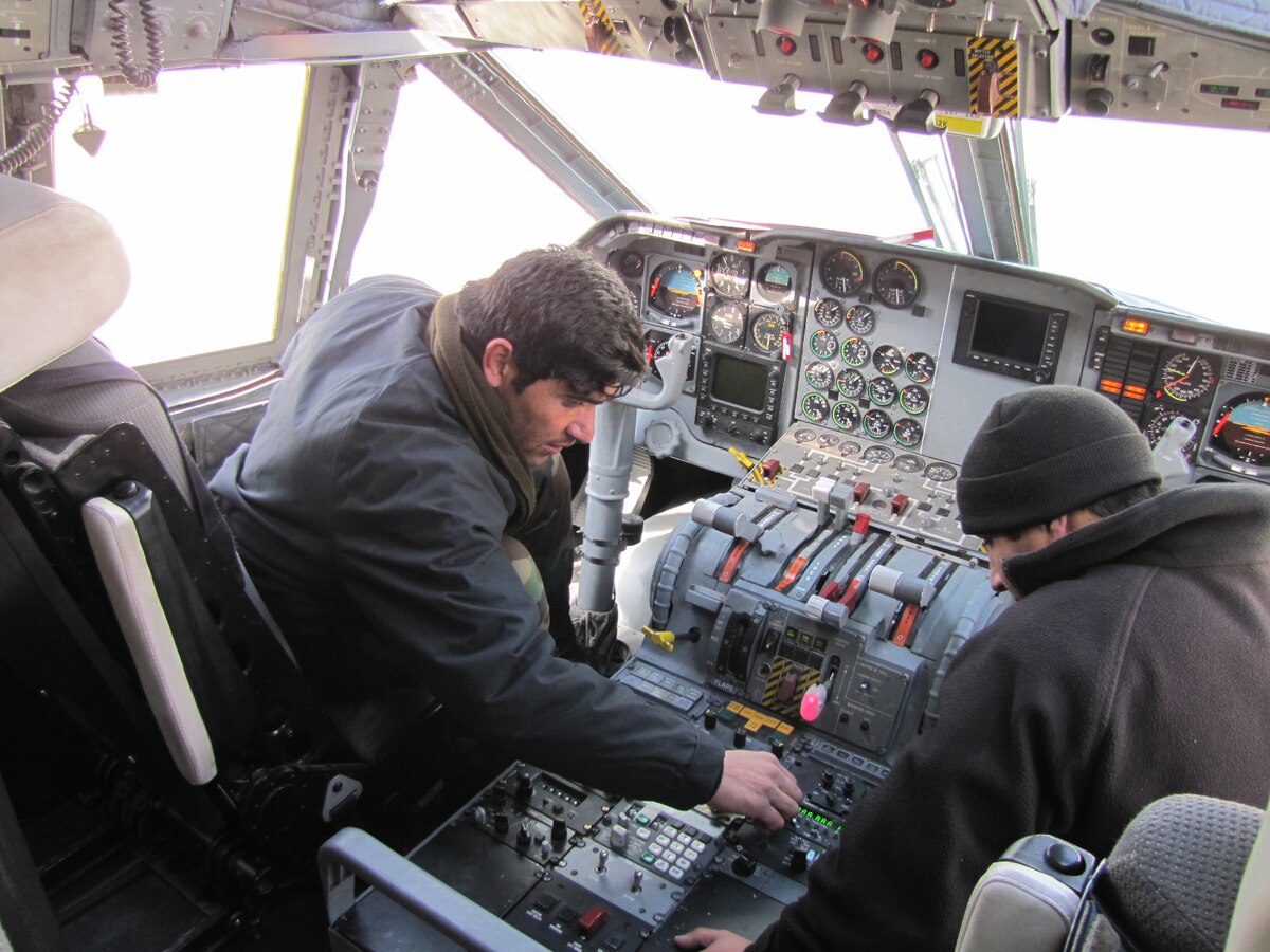 Afghan Air Force Sgt. 1st Class Zaki, one of the initial cadre and the second C-27 AAF avionics maintainer, trains Sgt. Samiullah, a crew chief and engine/body maintainer, on how to operationally check the V/UHF radio during the preflight March 5. (U.S. Air Force photo by Capt. Rob Leese).