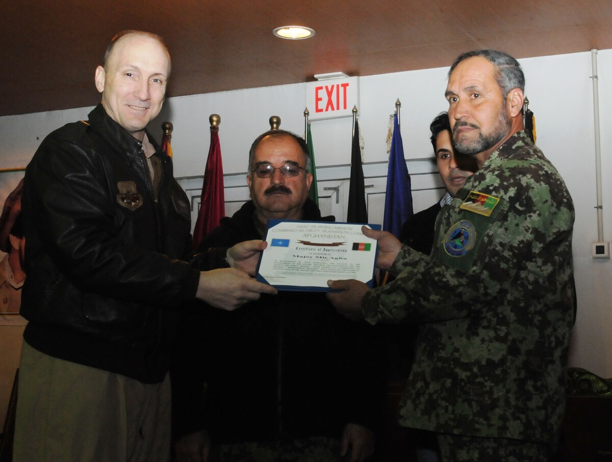 Afghan Air Force Maj. Mer Agha, the AAF’s aviation life support equipment shop chief, receives a certificate in recognition of his halting a false promotion during a ceremony at the Afghan Air Force Base in Kabul Feb. 22. (U.S. Navy photo by Mass Communications Specialist 3rd Class Jared Walker)