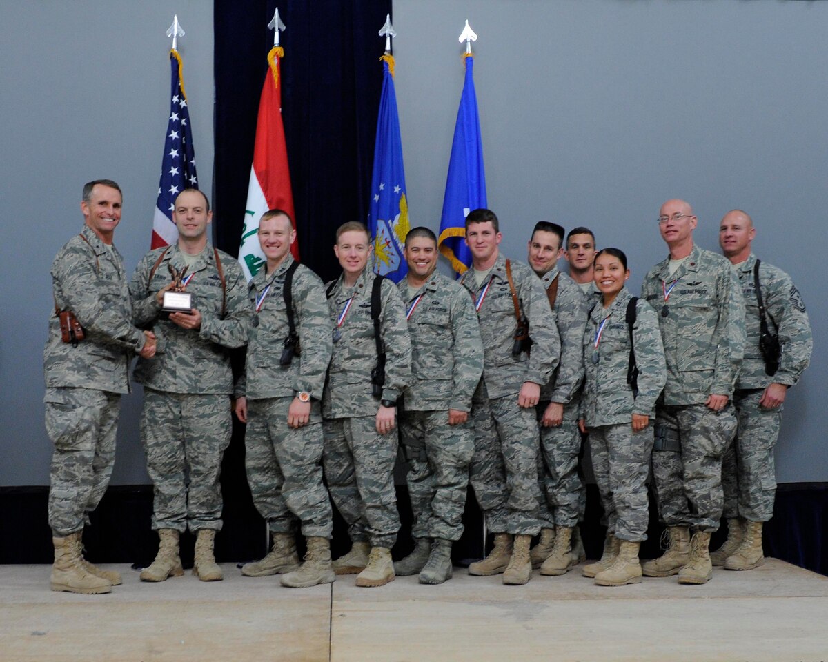 The 2010 Noncommissioned Officer of the Year is Tech. Sgt. Paul Kinsey, 321st Expeditionary Mission Support Advisory Group. Sergeant Kinsey (second from left) is the Non-commissioned Officer in Charge, Lead Communications Advisor, he led the wing’s best badge program and was proactive in inventorying 166 rooms in less than two days, enabling the transfer to the Base Transition Team and keeping the Iraqi Air Force bed down plan on track. Sergeant Kinsey was an outstanding Basic Life Support mentor and ensured training plans were followed. He guided 27 Iraqi Airmen on H2O generator support, ensuring 39 buildings and 438 IqAF members were ready to host incoming Iraqi Security Forces. (U.S. Air Force photo by Staff Sgt. Levi Riendeau)