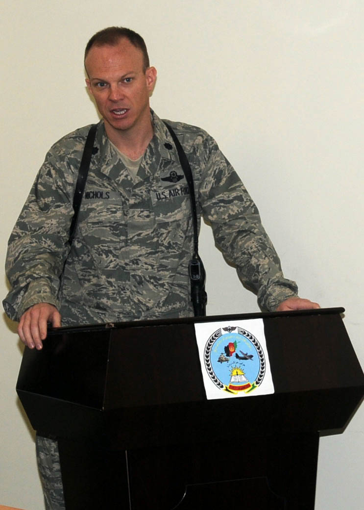 KABUL, Afghanistan - Guest speaker, Kazma Sarwi, an Afghan Instructor, speaks at a graduation of 30 Afghan Air Force members from 4 different courses at Pohantoon-e-Hawayee, the Afghan Air Force's "BIg Air School" in Kabul, Afghanistan, on Jan. 13. (U.S. Navy photo by Mass Communications Specialist 3rd Class Petty Officer Jared E. Walker/ RELEASED).