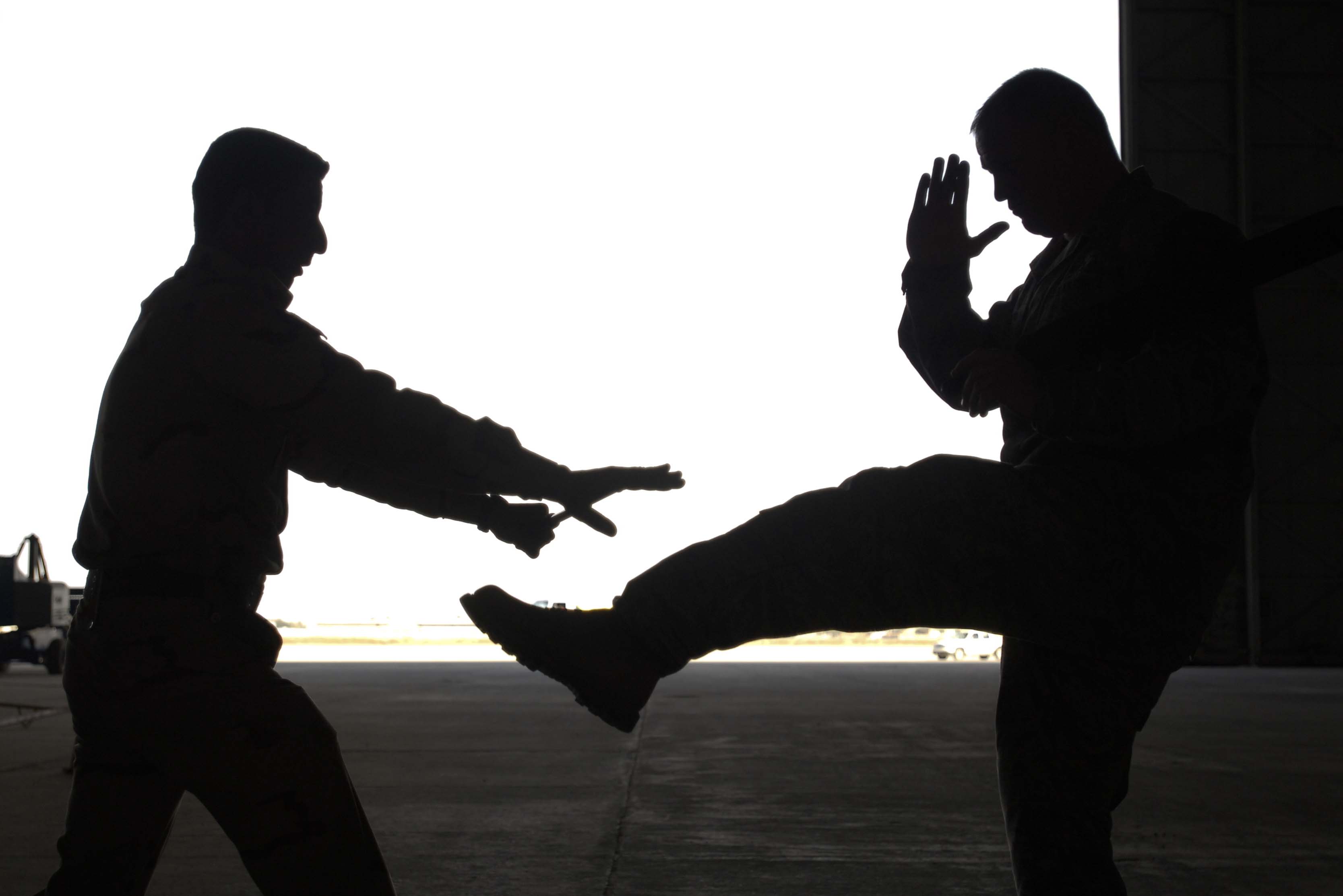 Staff Sgt. Timothy DeTerra, New Al-Muthana Air Base Transition Team member, defends himself from a baton attack by a member of the Iraqi Air Force during a training session Dec. 23. This training is the first of its kind held at NAMAB, and promises to help the IqAF build a reliable and secure force in the year ahead. (U.S. Air Force photo by Tech. Sgt. Randy Redman/Released)