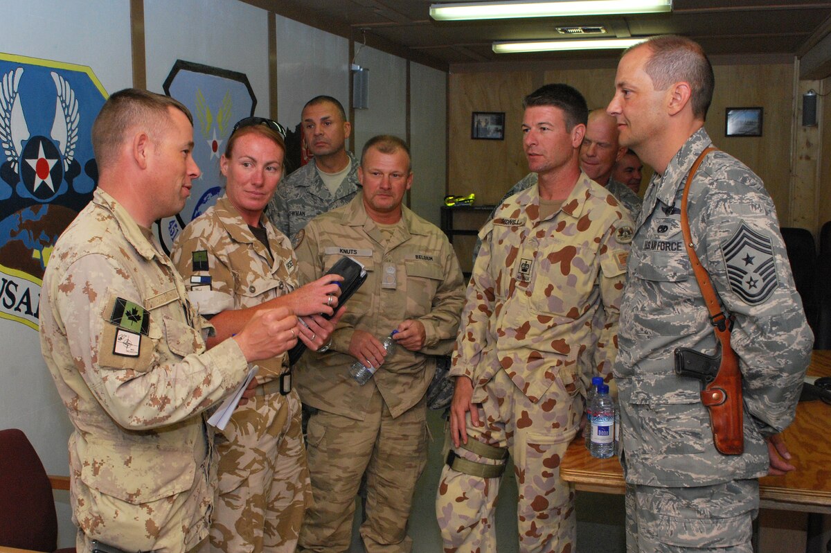 Canadian Forces Petty Officer 1st Class Martin Cashin answers a question from a U.S. Air Force member at a senior NCO panel Oct. 13 at Kandahar Airfield, Afghanistan. The Air Force SNCOs hosted the NATO members to increase the U.S. awareness of other nations’ military standards, customs and courtesies, and traditions. (U.S. Air Force photo/Senior Airman Melissa B. White)
