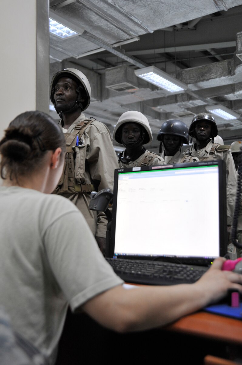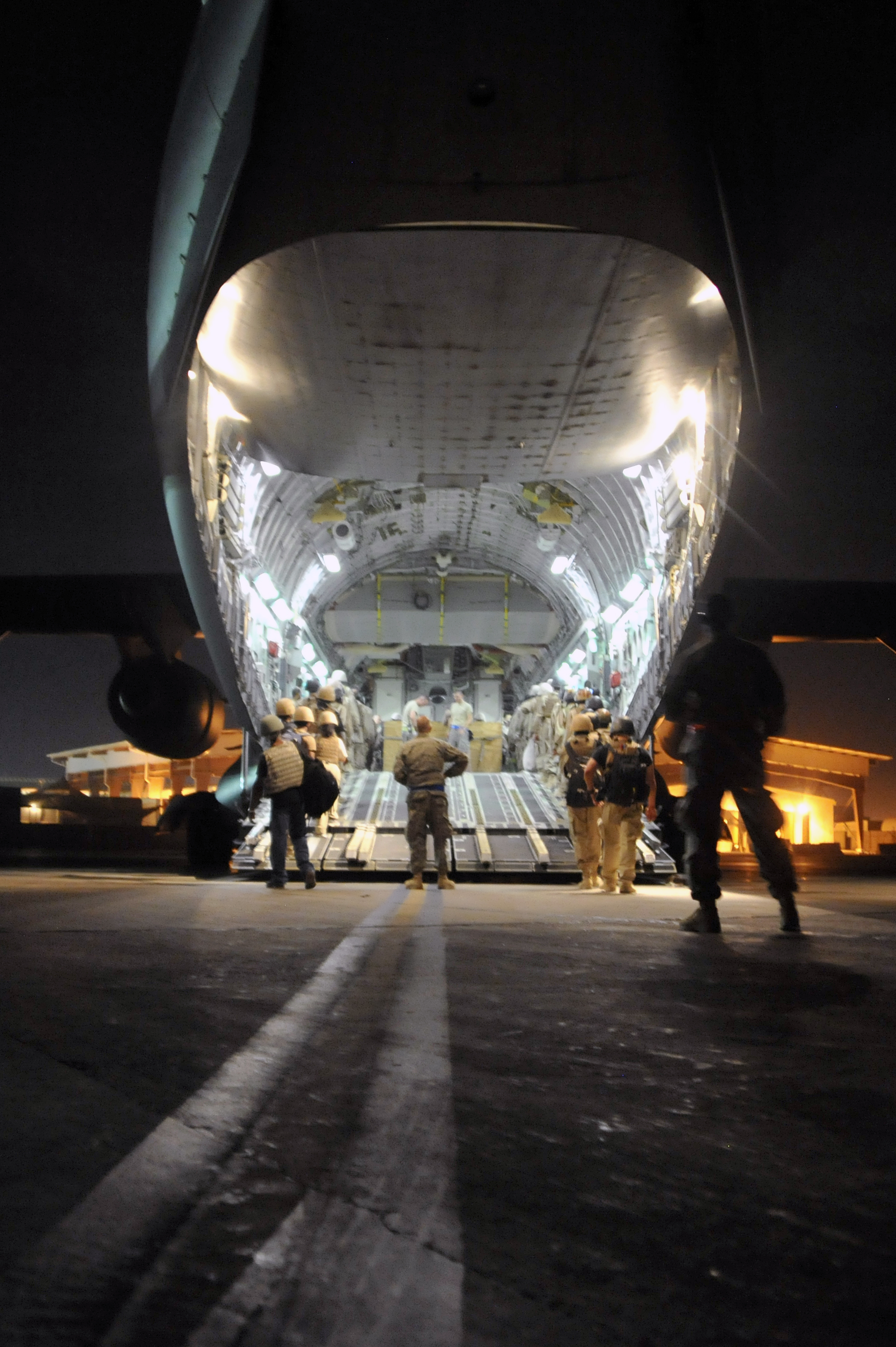 A C-17 Globemaster III loadmaster gives the thumbs up to 447th Expeditionary Logistics Readiness Squadron aerial porters while loading palletized baggage, Aug. 6, 2010, at Sather Air Base, Iraq. Air Force assets have been able to continue normal personnel and cargo movements along with supporting the Responsible Drawdown of Forces, which is on track to bring the number of operational forces down to 50,000 troops. ( U.S. Air Force photo by Senior Airman Perry Aston) (Released)