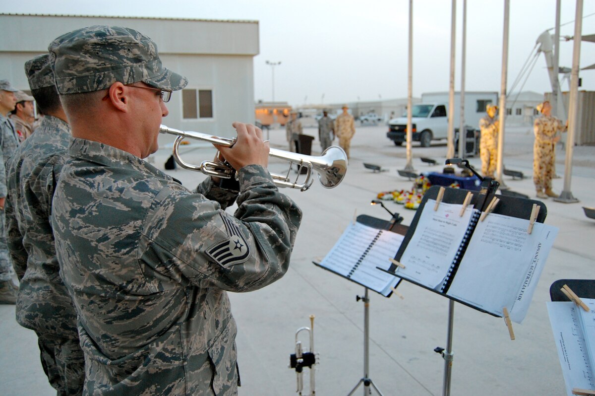 Members of the U.S. Air Forces Central Command Band "Vector" pause for a photo following their first performance in the AOR. Master Sgt. Robert Newlin, Horn; Staff Sgt. John Garcia, Trombone; Master Sgt Paul Perez, Percussion; Staff Sgt. Christopher Moore, Tuba; Staff Sgt. Mark Nixon, Trumpet; and Staff Sgt. Jonathan Rattay, Trumpet, with Chaplain (Capt.) Sean Ballard of the 379th Air Expeditionary Wing. (U.S. Air Force photo/Maj. Chad Steffey/released)