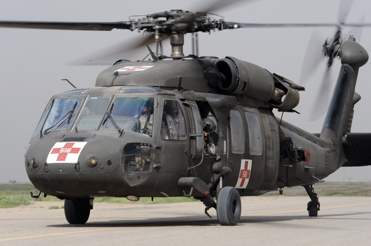 U.S. Army Helo Medevac Team 2, one of four in Iraq, returns from a mission at Kirkuk Regional Air Base, Iraq on Feb. 24, 2010. All four crews on the team have two pilots, a crew chief and a medic for each mission. Kirkuk’s team responds to any U.S forces injuries within 100 miles of the surrounding area. (U.S. Air Force photo/Staff Sgt. Tabitha Kuykendall/Released)
