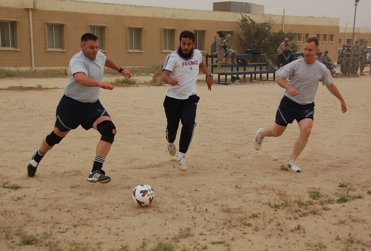 U.S. Air Force Capt. Matthew Olson, left, and Staff Sgt. Jauron Myles, right, defend against a host nation Coalition member during a soccer scrimmage Feb. 24, 2010 at an air base in Southwest Asia. The 386th Air Expeditionary Wing’s team hopes to gain the championship title from the undefeated host nation team at a later date. (U.S. Air Force photo by Staff Sgt. Lindsey Maurice/Released)