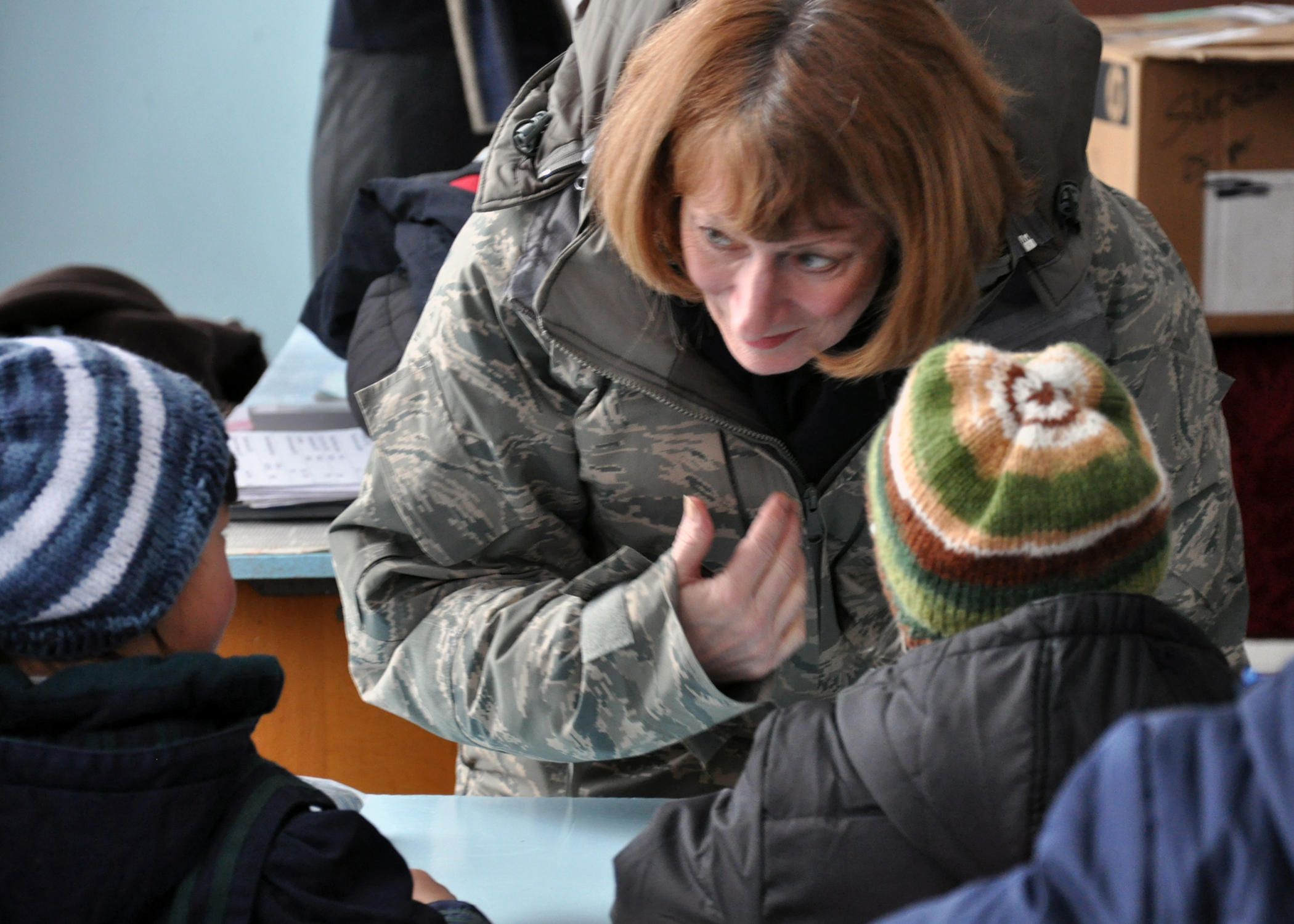 Maj. Gen. David Eichhorn, Commander, Air Force Flight Test Center, Edwards Air Force Base, Calif., and Maj. Gen. Andrew Busch, Commander, Ogden Air Logistics Center, Hill Air Force Base, Utah, hand candy to elementary school children of the Grozd School in Grozd Village, Kyrgyzstan, Feb. 9, 2010. (U.S. Air Force photo/Senior Airman Nichelle Anderson/released)
