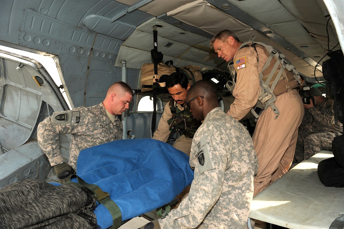 U.S. Army Staff Sgt. David Marshall (left), Charley Company, 2-3 Aviation, Task Force Knighthawk, Pfc. Jeff Rucker (lead), and Spc. Nathan Freel, 36th Air Support Medical Company, escort an Afghan solder to a rotary wing medical evacuation on Bagram Airfield Feb. 3, 2010. This rotary wing medevac is the first of its kind in Afghanistan, where a combined Afghan and U.S. crew takes Afghans from coalition medical facilities and returns them to Afghan facilities. (U.S. Air Force photo by/ Tech. Sgt. Jeromy K. Cross/released)