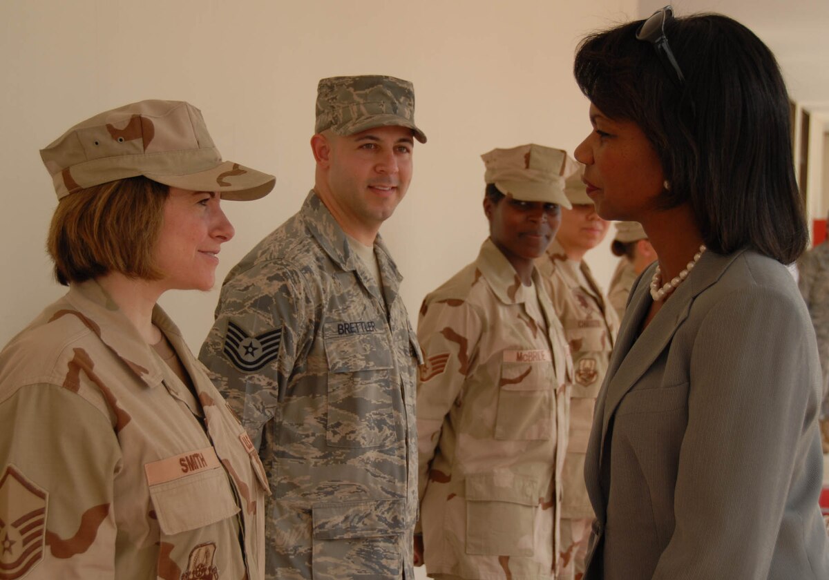 SOUTHWEST ASIA-- Senior Master Sgt. Christopher Mohr, 380th Air Expeditionary Wing, greets Secretary of State Condoleezza Rice here before she departed enroute to Singapore. Sergeant Mohr is deployed here from RAF Mildenhall, England.(U.S. Air Force photo/Tech. Sgt. Christopher A Campbell)(released)