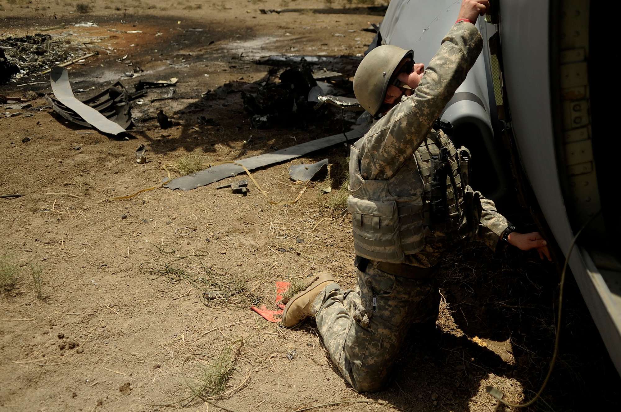 Senior Master Sgt. Pervis King, left, and Staff Sgt. Joshua Langdon from the 447th Air Expeditionary Group's Explosive ordnance disposal team inspect explosive charges placed around the wings of the of a C-130 Hercules aircraft that are designed to divide the plane into smaller sections so it can be moved July 7 in Baghdad, Iraq. The C-130 made an emergency landing in a field north of the Baghdad International Airport shortly after take-off on June 27. (U.S. Air Force photo/Tech. Sgt. Jeffrey Allen)