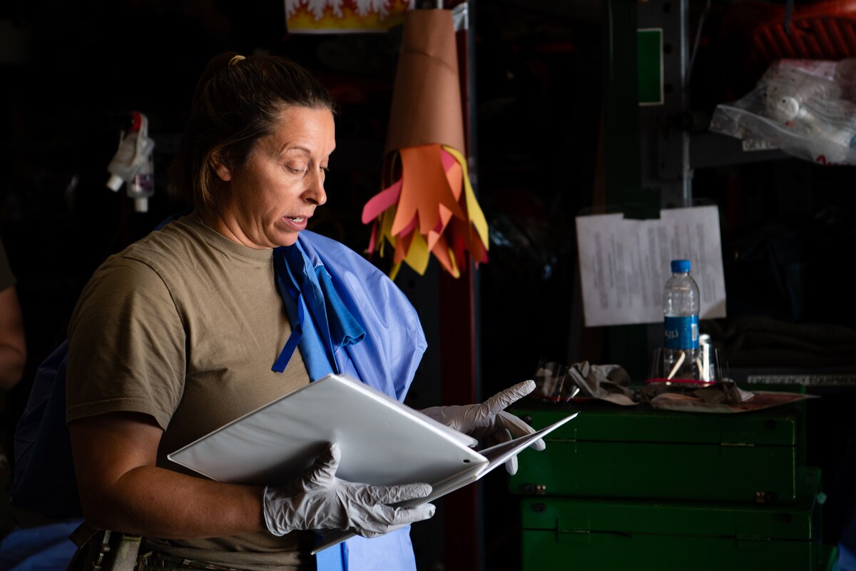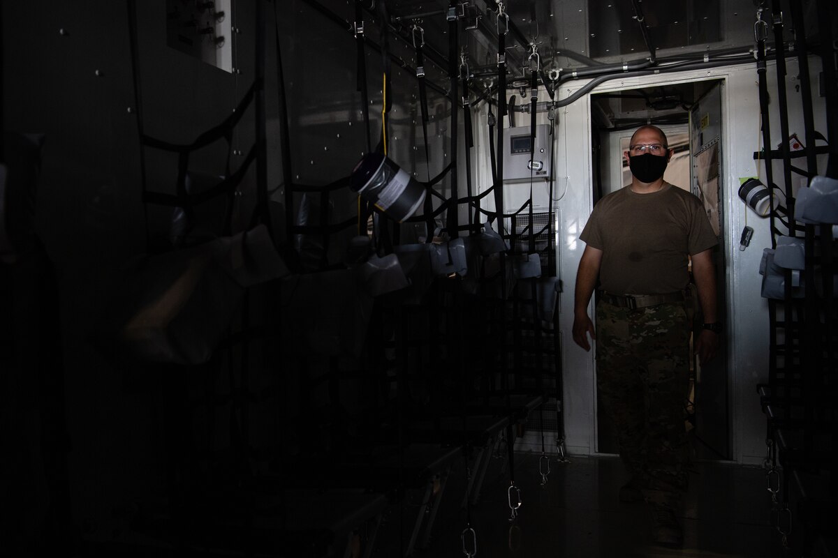 U.S. Air Force Master Sgt. Ryan McClellan, right, and Staff Sgt. Kyle Sshmidt, Air Mobility Command aircrew training cadre, unload and stage equipment for a training exercise with the Negatively Pressurized Conex-Lite in Southwest Asia, July 30, 2020. The NPC-Lite is the latest isolated containment chamber developed for intra-theater airlift of individuals with infectious diseases like COVID-19 and is designed to fit inside a C-130 Hercules aircraft. (U.S. Air Force photo by Staff Sgt. Justin Parsons)
