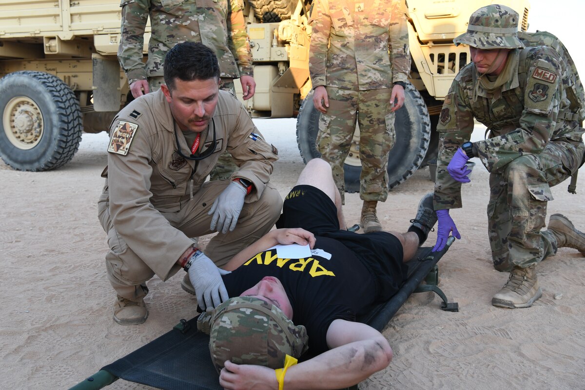 Joint force mass casualty exercise hones medics’ skills -- Joint Force medical service members participated in a mass casualty exercise held by 378th Expeditionary Medical Squadron Nov. 3, 2020 at Prince Sultan Air Base, Kingdom of Saudi Arabia.