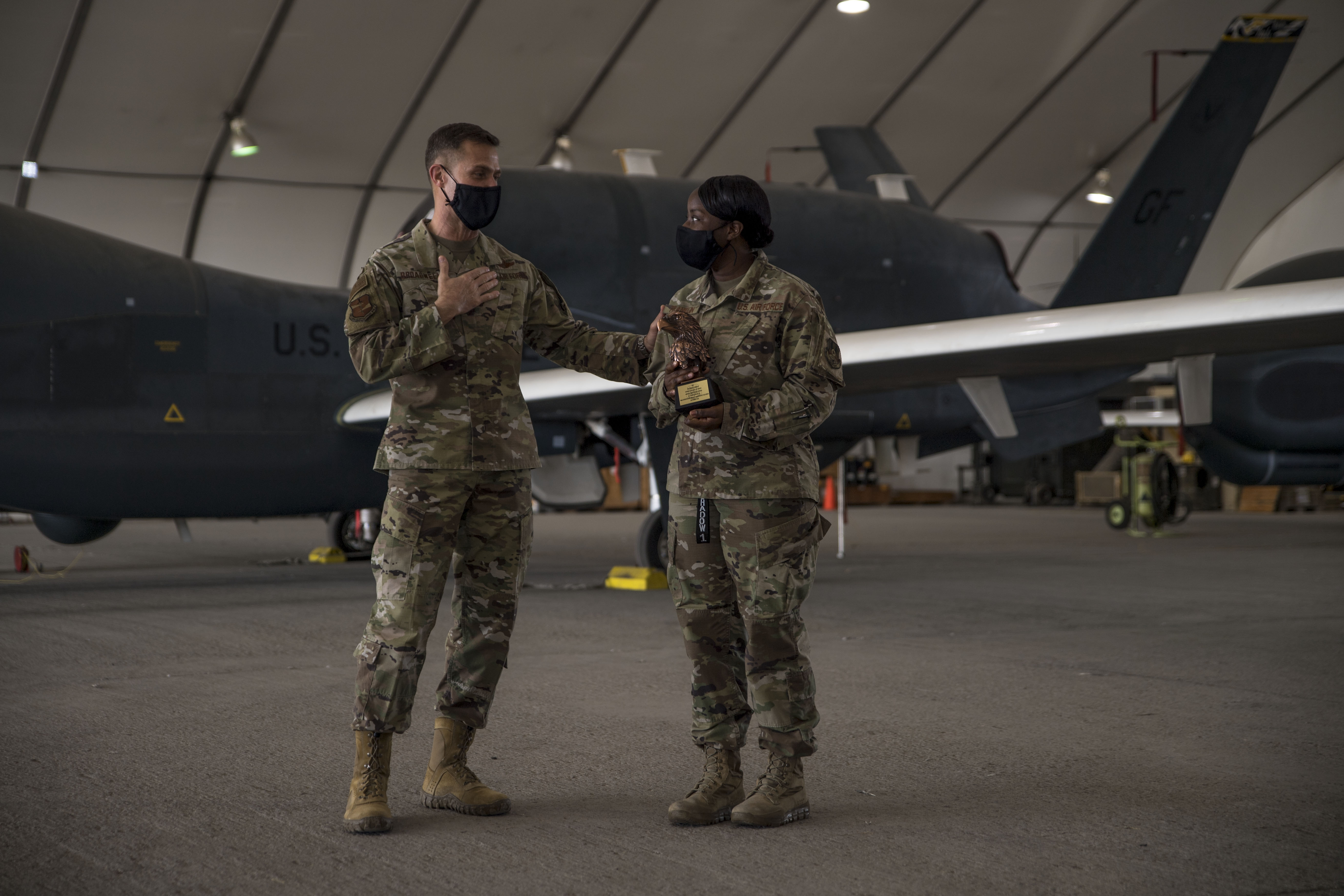 U.S. Air Force Brig. Gen. Larry Broadwell, 380th Air Expeditionary Wing commander, congratulates 1st Lt. Teirra Franklin, 380th Expeditionary Aircraft Maintenance Squadron, HAWK Aircraft Maintenance Unit officer in charge, after presenting her the Air Combat Command level General Lew Allen, Jr. Award at Al Dhafra Air Base, United Arab Emirates, Dec. 24, 2020. The award is given annually to an officer and a senior noncommissioned officer in the aircraft maintenance or munitions career fields directly involved with coordinating and executing aircraft sorties. (U.S. Air Force photo by Senior Airman Aaron Larue Guerrisky)