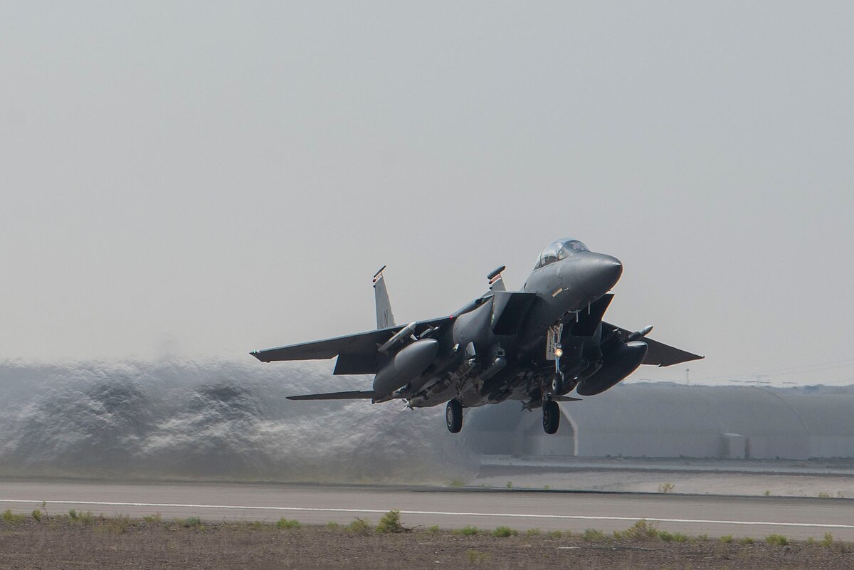 A U.S. Air Force F-15E Strike Eagle from the 494th Expeditionary Fighter Squadron (EFS) takes off from Al Dhafra Air Base, United Arab Emirates, in support of regional security operations, April 30, 2021. The 494th EFS, assigned to the 332nd Air Expeditionary Wing, re-located to Al Dhafra Air Base to help provide air power to protect U.S. and coalition forces as they conduct drawdown operation from Afghanistan. (U.S. Air Force photo by Staff Sgt. Zade Vadnais)