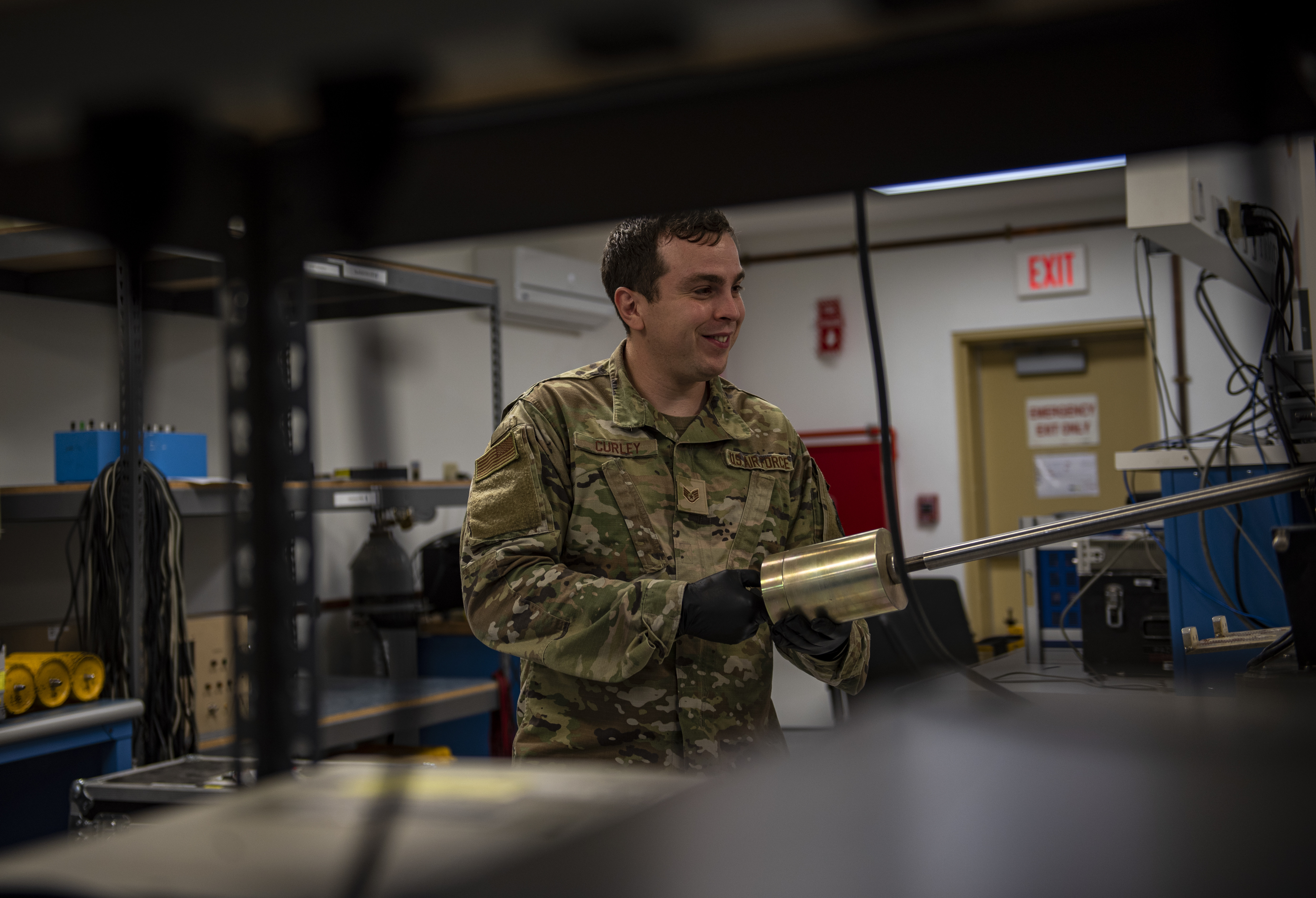 Senior Airman Jonathan Chong (left), 379th Expeditionary Maintenance Squadron physical and dimensional technician, trains Senior Airman Marc Rosales (right), 379th EMXS physical and dimensional technician, how to detect contaminations in an oxygen pressure guage on oxygen test measurement diagnostic equipment July 30, 2021, at Al Udeid Air Base, Qatar. Chong and Rosales are part of the calibration section, which is the sole regional repair network node for Air Forces Central, supporting every base in the area of responsibility. (U.S. Air Force photo by Airman 1st Class Kylie Barrow)