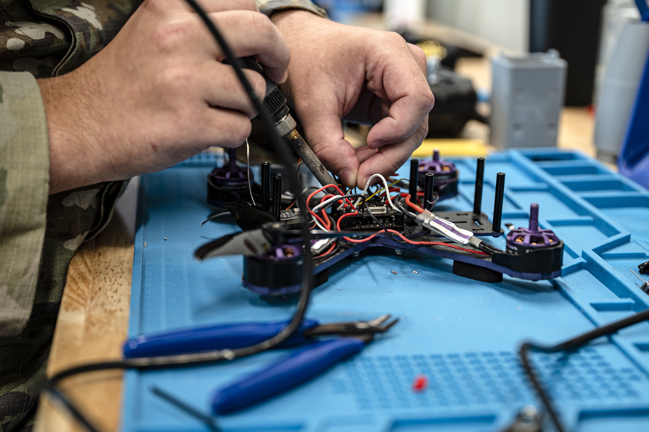 The AFCENT Battle Lab only has three permanent party positions, but a rotation of four enlisted deployers rounds out the team. These Airmen, all U.S. Air Force software engineers, spend their first couple weeks learning the skills they need to design and build drones, including 3D rendering, soldering and drone operation.