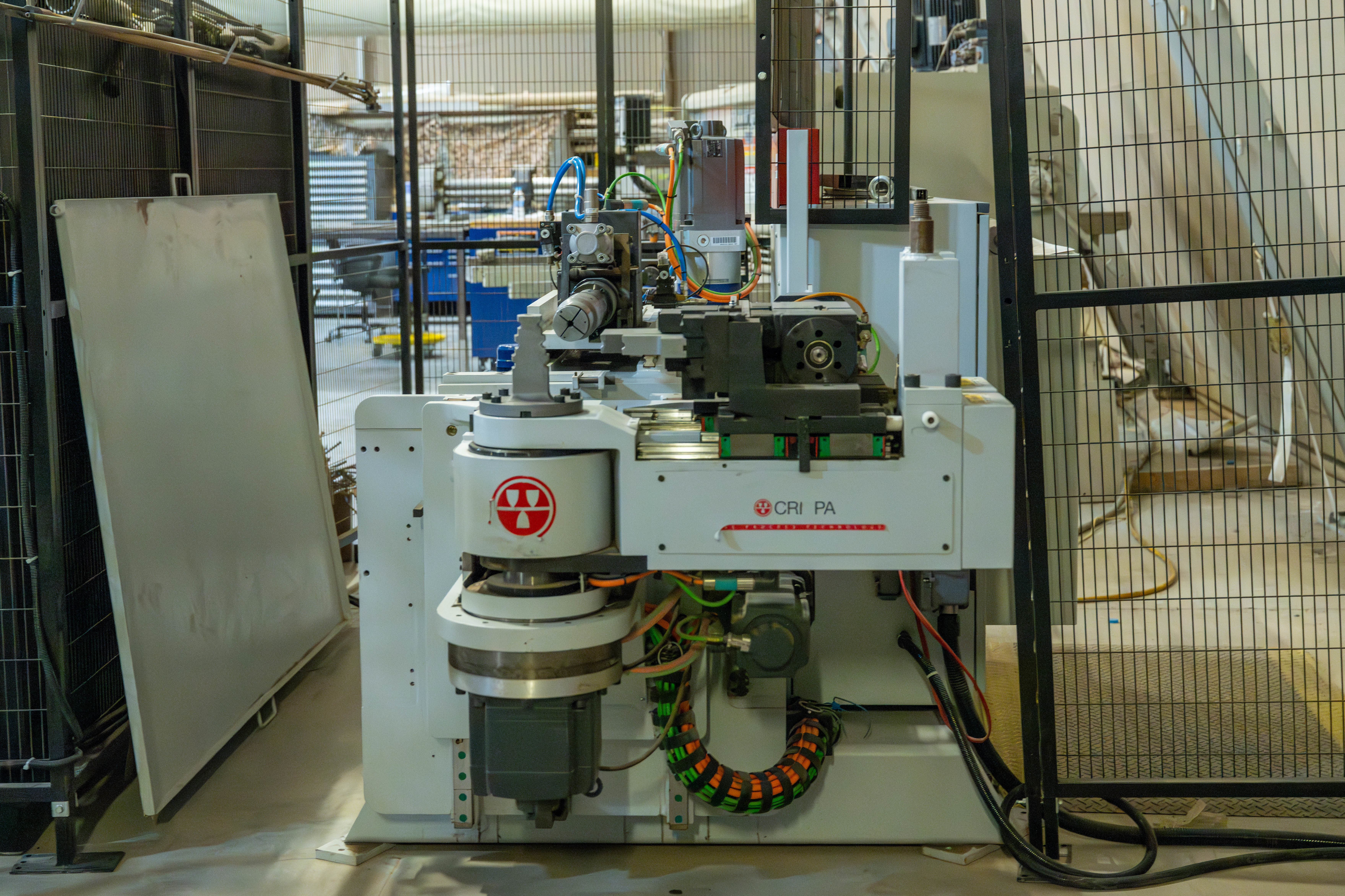 The Crippa machine produces a finished tube in less than a minute by using programmed schematics that control the degree, radius, and placement of each bend.