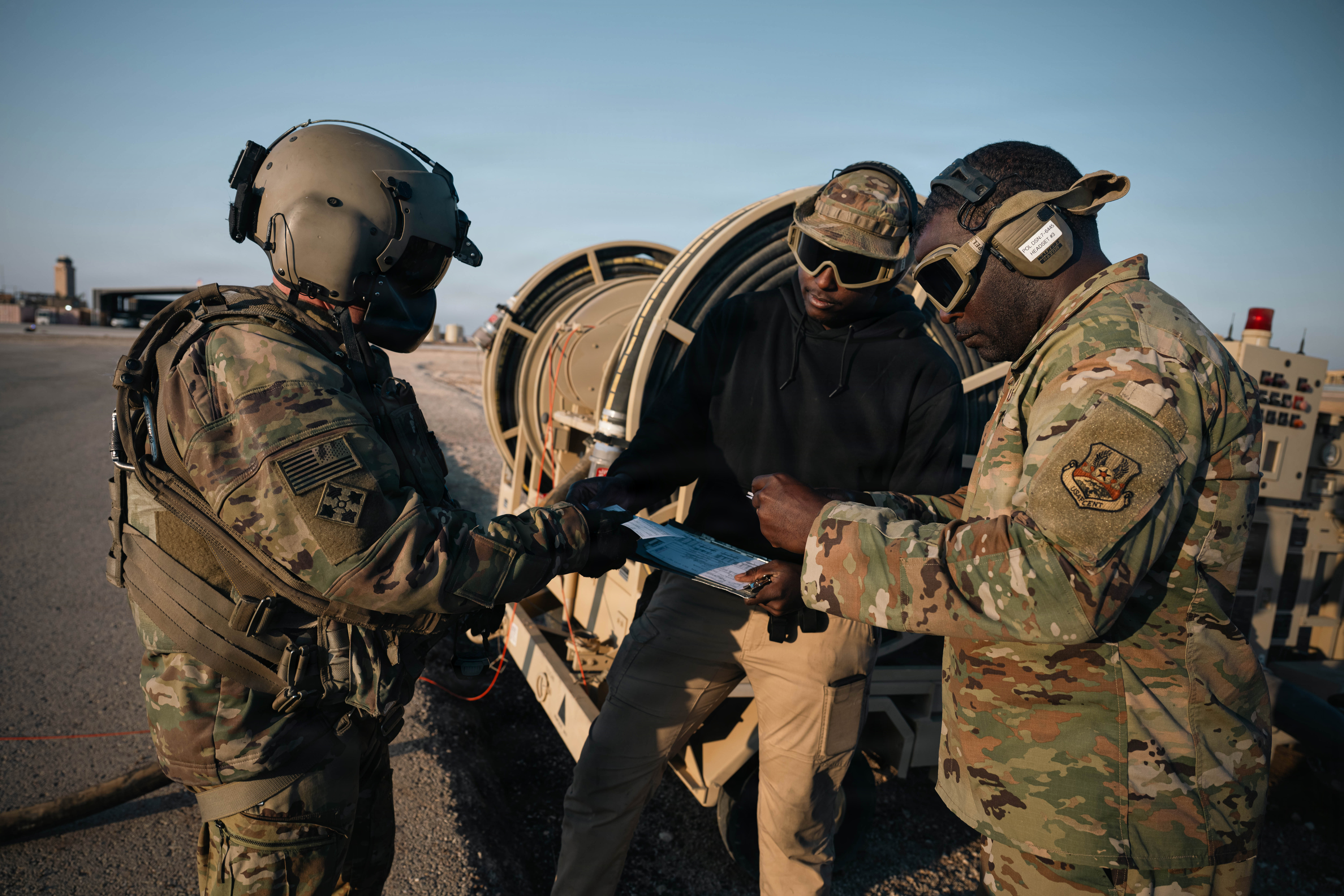U.S. CENTRAL COMMAND AREA OF RESPONSIBILITY -- For the first time at this location, U.S. Airmen assigned to the 332nd Expeditionary Logistics Readiness Squadron conducted a hot-pit refueling operation using an R-20 expeditionary refueling system to support a U.S. Army UH-60 Black Hawk helicopter on a flightline within the U.S. Central Command area of responsibility, Dec. 14, 2025, significantly reducing aircraft ground time and expanding expeditionary fueling capabilities.