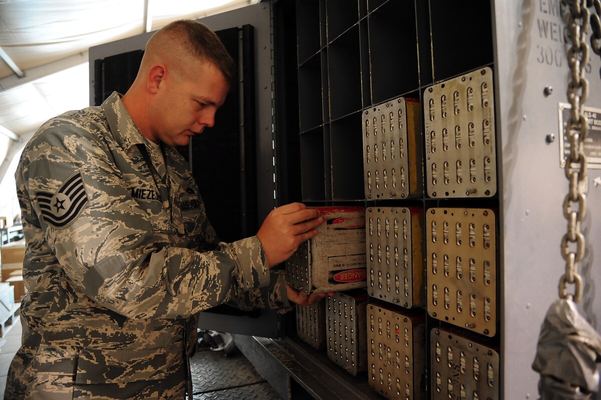 U.S. Air Force Airman 1st Class David Duston, left, and Airman 1st Class Jeremy Gomez, both munitions crew members, inspect 20 mm rounds during Exercise Eager Lion June 4, 2014, at an air base in northern Jordan. Both Airmen are from the 35th Maintenance Squadron at Misawa Air Base, Japan, and are providing munitions support during the exercise for F-16 Fighting Falcons also from Misawa. (U.S. Air Force photo by Staff Sgt. Brigitte N. Brantley/Released)