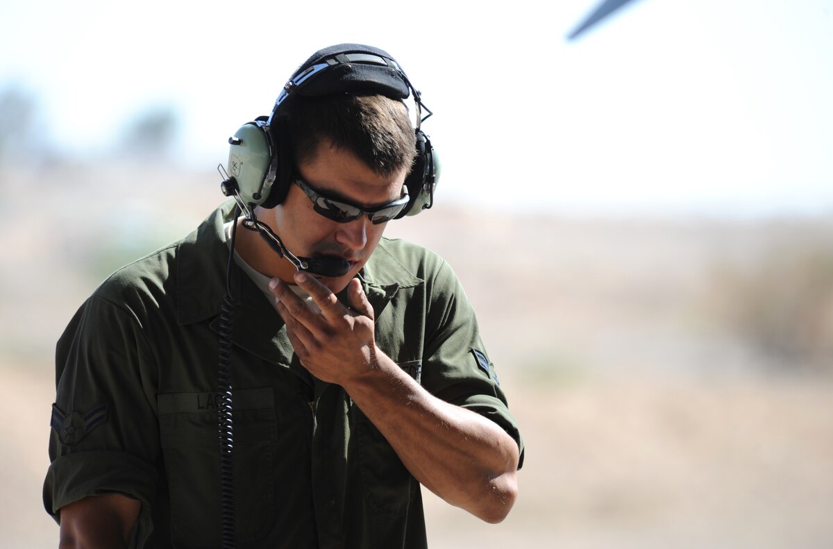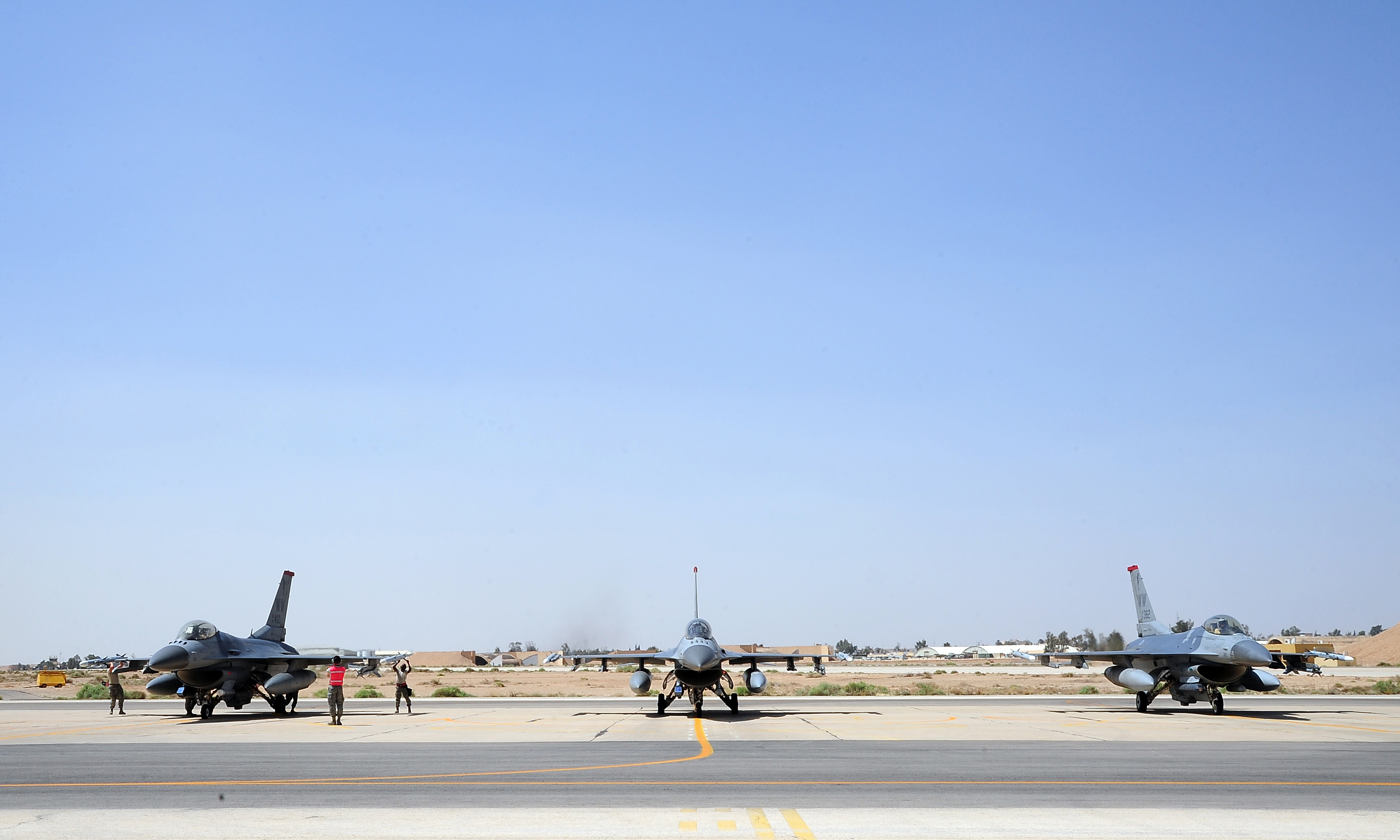 U.S. Air Force Airman 1st Class John Lace, an assistant dedicated crew chief with the 13th Aircraft Maintenance Unit at Misawa Air Base, Japan, communicates with an F-16 Fighting Falcon pilot after a preflight check during Exercise Eager Lion May 27, 2014, at an air base in northern Jordan. Along with crew chiefs, many other maintenance career fields, including avionics, phase and weapons, are responsible for getting the F-16s in the air. This year, more than 12,500 personnel from more than 20 nations are participating in the exercise, which is designed to strengthen military-to-military relationships and interoperability. (U.S. Air Force photo by Staff Sgt. Brigitte N. Brantley/Released)